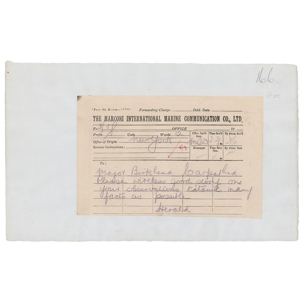 The first, undated, is written in pencil on an 8.5 x 5.25 Marconi International Marine Communication Company telegram sheet, and reads: “Major Birkhead Carpathia / Please wireless good story on your observations Titanic many facts as possible / Herald.†The sheet is numbered “3/3,†and was sent to “MSD†by “HC†[Harold Cottam] at 5:20 PM. The second, stamped “Carpathia†and dated to April 17, 1912, is written in pencil on two overlapping Marconi sheets, and reads: “EN Kimball Jr. Carpathia / Boston Globe anxious get full narrative disaster can you write it for delivery to Globe representative on dock New York will pay liberally rush answer to Winfield Thompson Globe man on steamer Franconia his expense he also desires wireless story on of your experiences for immediate transmittal Boston every moment precious intense interest at home / Winfield Thompson.†The sheet is numbered “2/3,†sent from “Franconia†to “MEA†at 6:30 AM. In overall fine condition. These documents were obtained by Titanic Historical Society members John and Vera Gillespie from John Booth, the author of the book, Titanic Signals of Disaster, published by White Star in 1993.
