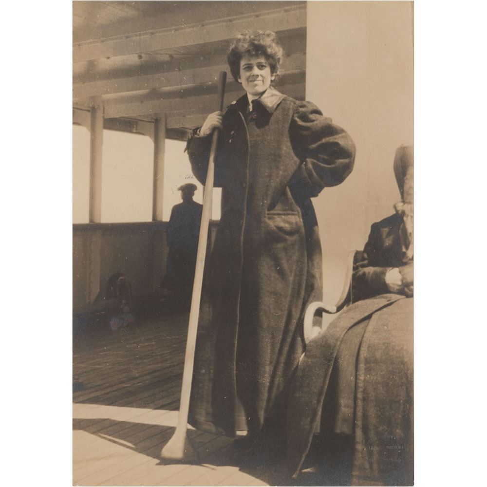 May R. Birkhead of Louisiana, Missouri, was a 30 year-old seamstress travelling with her aunt aboard the Carpathia on leisure. When the Titanic disaster occurred, she contacted her friend Eric Hawkins of the New York Herald and became the unofficial ‘on-ship reporter.’ She obtained first-person accounts and also obtained several sketches and two rolls of film. Her combined story in the Herald on Friday, April 19th, was historic in that its chilling contents were picked up by journalists across the country. Included is a vintage matte-finish 5.75 x 8 photo of Birkhead taken aboard the Carpathia by Chicago physician and novice photographer, Dr. Frank Blackmarr.
