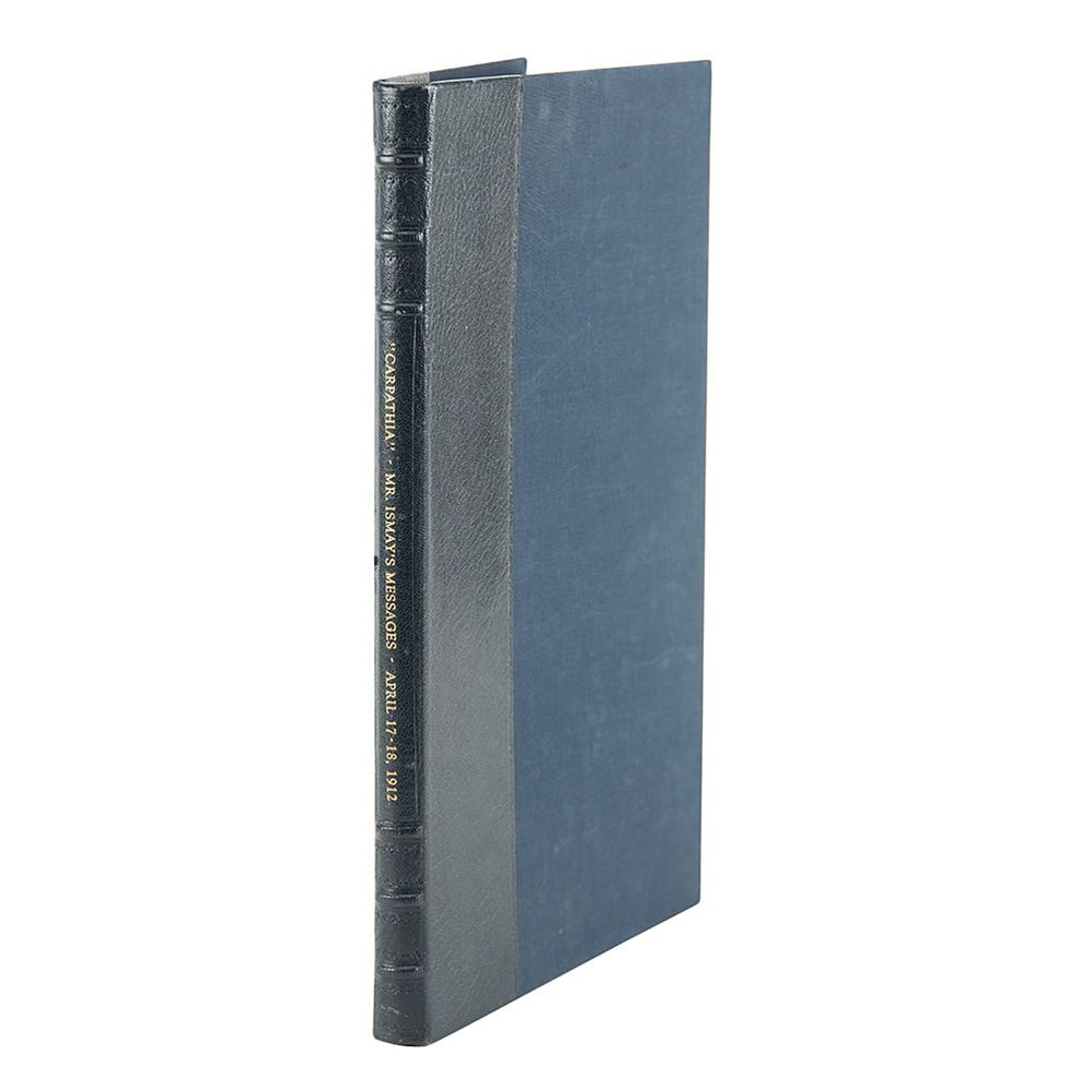Extraordinary group of eight Marconigrams sent by Bruce Ismay, managing director of the White Star Line, the fleet to which the Titanic belonged, just after his rescue from the sinking by the Cunard liner Carpathia, April 15-18, 1912. Each Marconigram is filled out in pencil, stamped "Copy," measures 8.75 x 5.75, and affixed inside a larger album marked: "Book No. 1 Copy, Carpathia, Mr. Ismay's mges sent and received." The first telegram in the series bears Ismay's full name, all subsequent telegrams bear the name "Yamsi," Ismay's name spelled backwards; also included are three telegrams sent by Phillip A. S. Franklin to Ismay on board the Carpathia, responding to his messages. This correspondence forms a stunning record of the communication of the White Star Line's highest-ranking survivor just after the sinking of the Titanic.