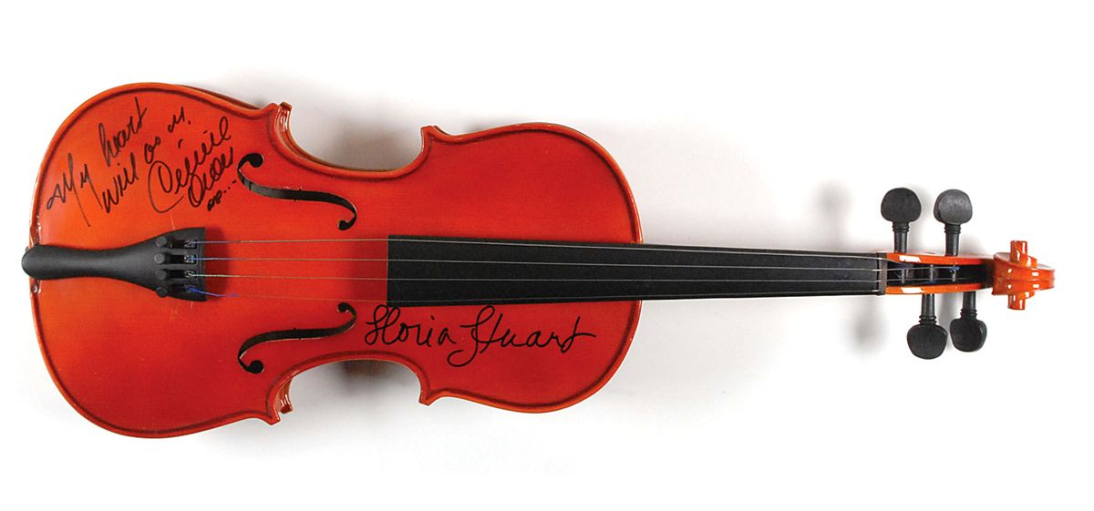 Natural wood-finish Cremona violin, signed in person in black felt tip, “My heart will go on…Celine Dion,” and “Gloria Stuart.” In fine condition. Originally obtained by in-person specialist Mike Wehrmann.