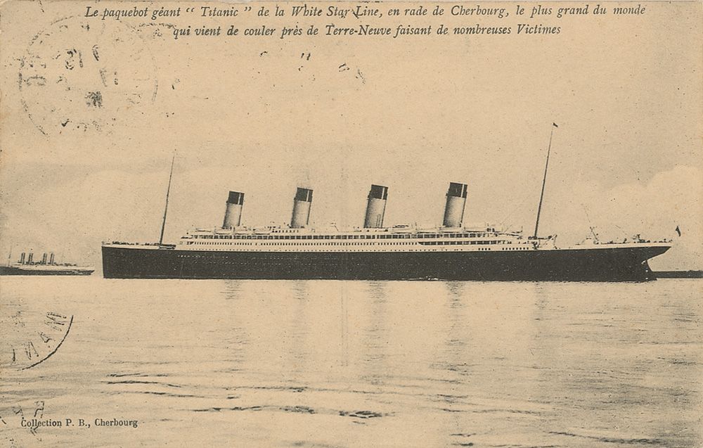 French postcard depicting the Titanic in Cherbourg Harbour by Collection P. B. of Cherbourg, captioned at the top: "Le paquebot geant ‘Titanic’ de la White Star Line, en rade de Cherbourg, le plus grand du monde qui vient de couler pres de Terre-Neuve faisant de nombreuses Victimes.” Postmarked July 17, 1915, in Cherbourg, and bears a brief untranslated letter in pencil in French. In fine condition, with some stray postmark ink to the front.