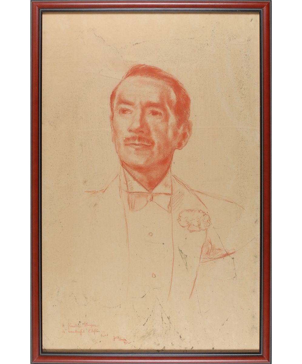 Original and impressive 17.5 x 27.5 red pastel portrait of Clifton Webb's Titanic character, Richard Ward Sturges, drawn by the film's director Jean Negulesco. Signed and inscribed at the bottom by Negulesco, "A flawless Sturges, a Wonderful Clifton-Love Jean, 1952." Framed to an overall size of 19.5 x 29.5. In fine condition, with some scattered light spotting. Oversized.