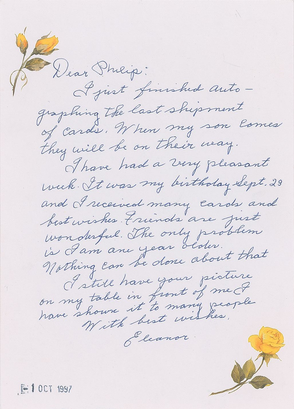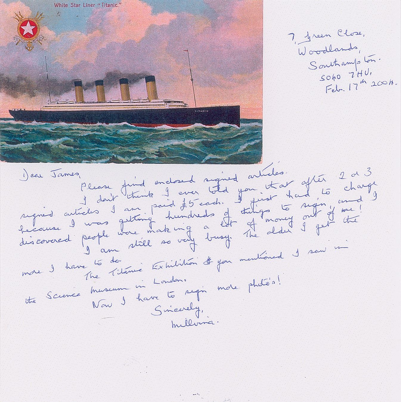 Two letters from Titanic survivors Millvina Dean and Eleanor Shuman: an ALS signed "Millvina," one page, 8.25 x 8.25, February 17, 2004, addressed to James, in part: "I don't think I ever told you that after 2 or 3 signed articles I am paid £5 each. I just had to charge because I was getting hundreds of things to sign, and I discovered people were making a lot of money out of me!"; and an ALS signed "Eleanor," one page, 6.25 x 8.75, stamp-dated October 1, 1997, addressed to Philip, in part: "I have had a very pleasant week. It was my birthday Sept. 23 and I received many cards and best wishes. Friends are just wonderful. The only problem is I am one year older. Nothing can be done about that." In overall fine condition.