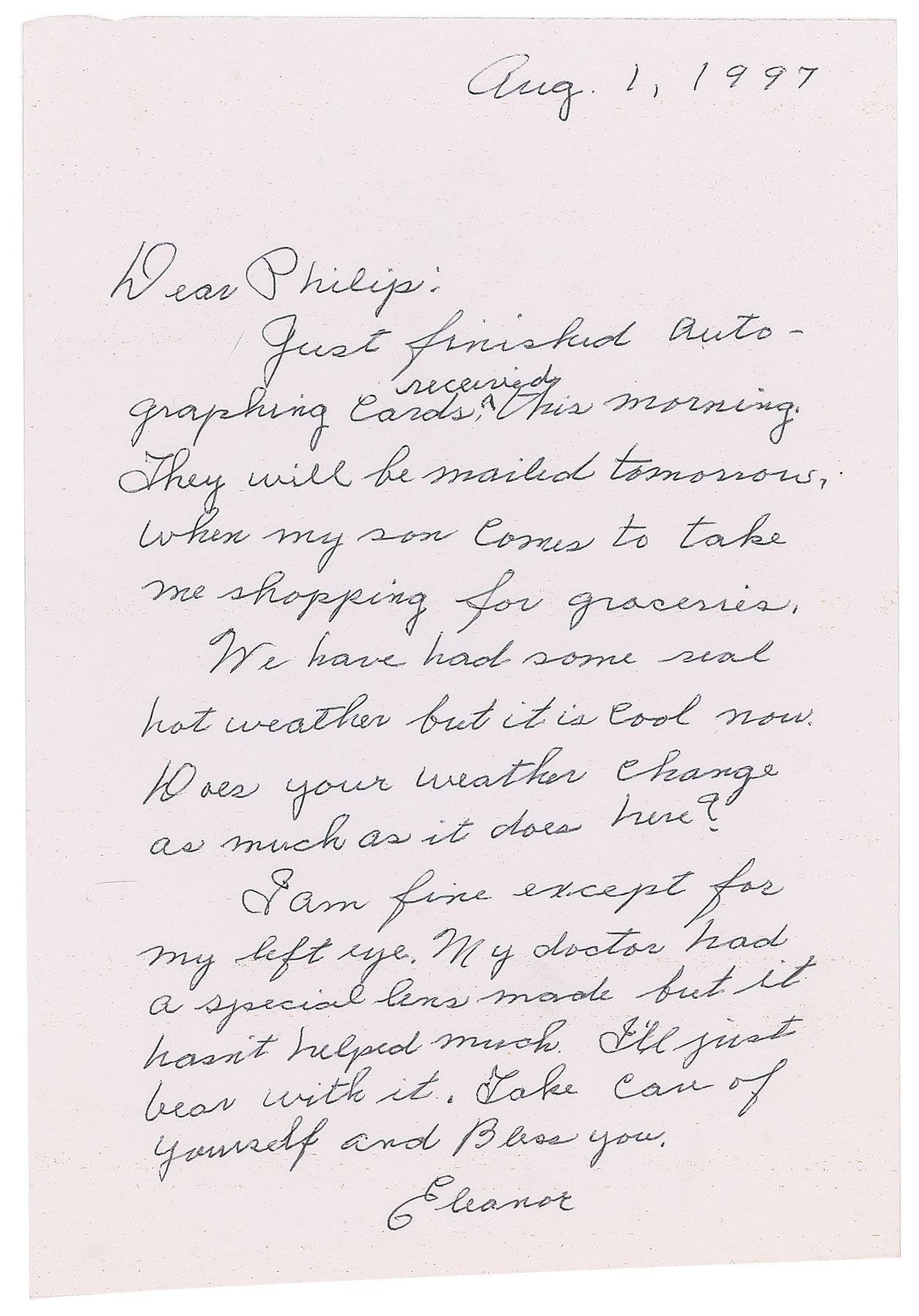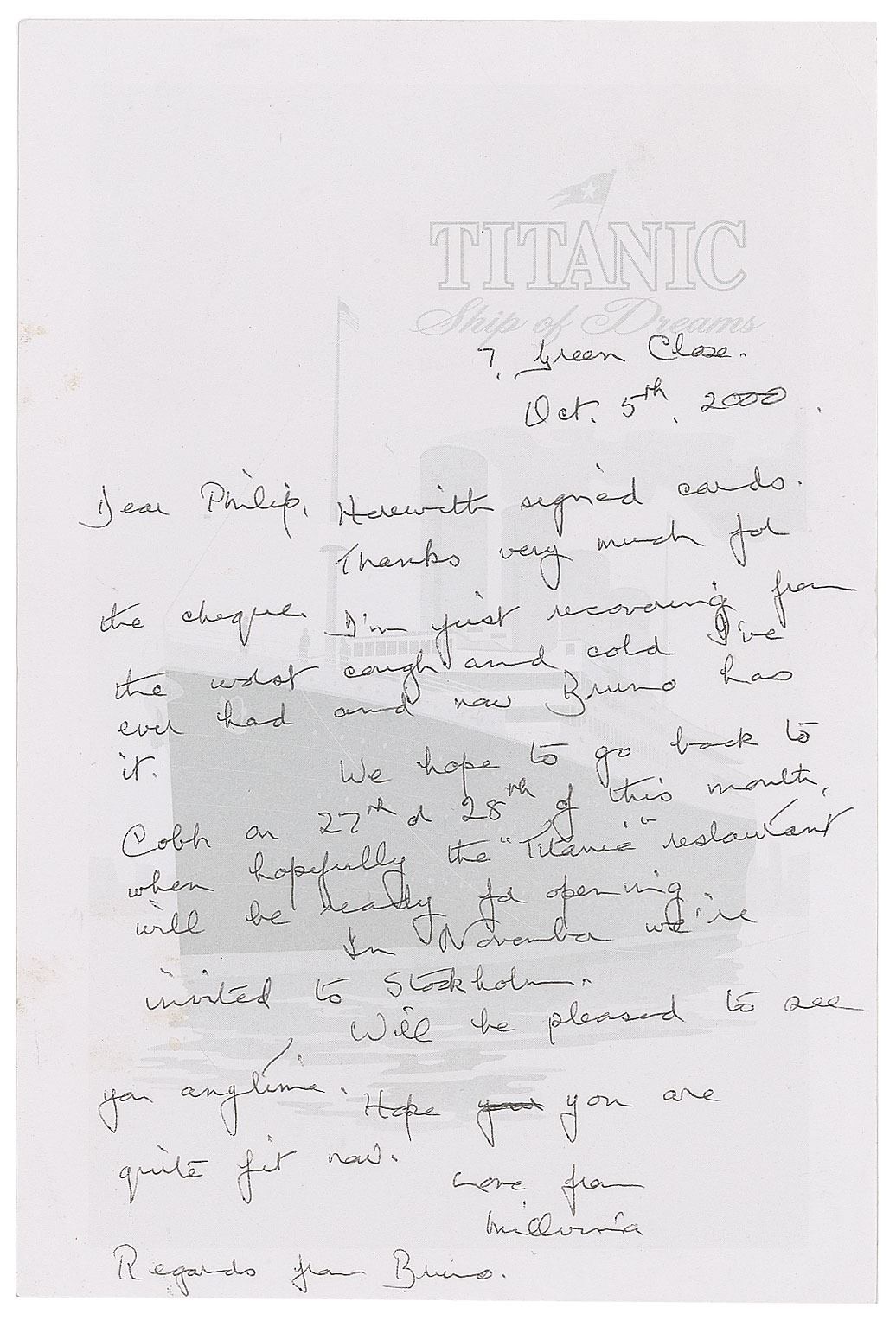 Two letters from Titanic survivors Millvina Dean and Eleanor Shuman: an ALS signed "Millvina," one page, 5 x 7.5, Titanic Ship of Dreams letterhead, October 5, 2000, in part: “I’m just recovering from the worst cough and cold I’ve ever had and now Bruno has it. We hope to go back to Cobh on 27th or 28th of this month, when. Hopefully the ‘Titanic’ restaurant will be ready for opening”; and an ALS signed "Eleanor," one page, 6 x 8.75, August 1, 1997, addressed to Philip, in part: "I am fine except for my left eye. My doctor had a special lens made but it hasn’t helped much. I’ll just bear with it. Take care of yourself and bless you.” In overall very good to fine condition, with creasing to both letters.