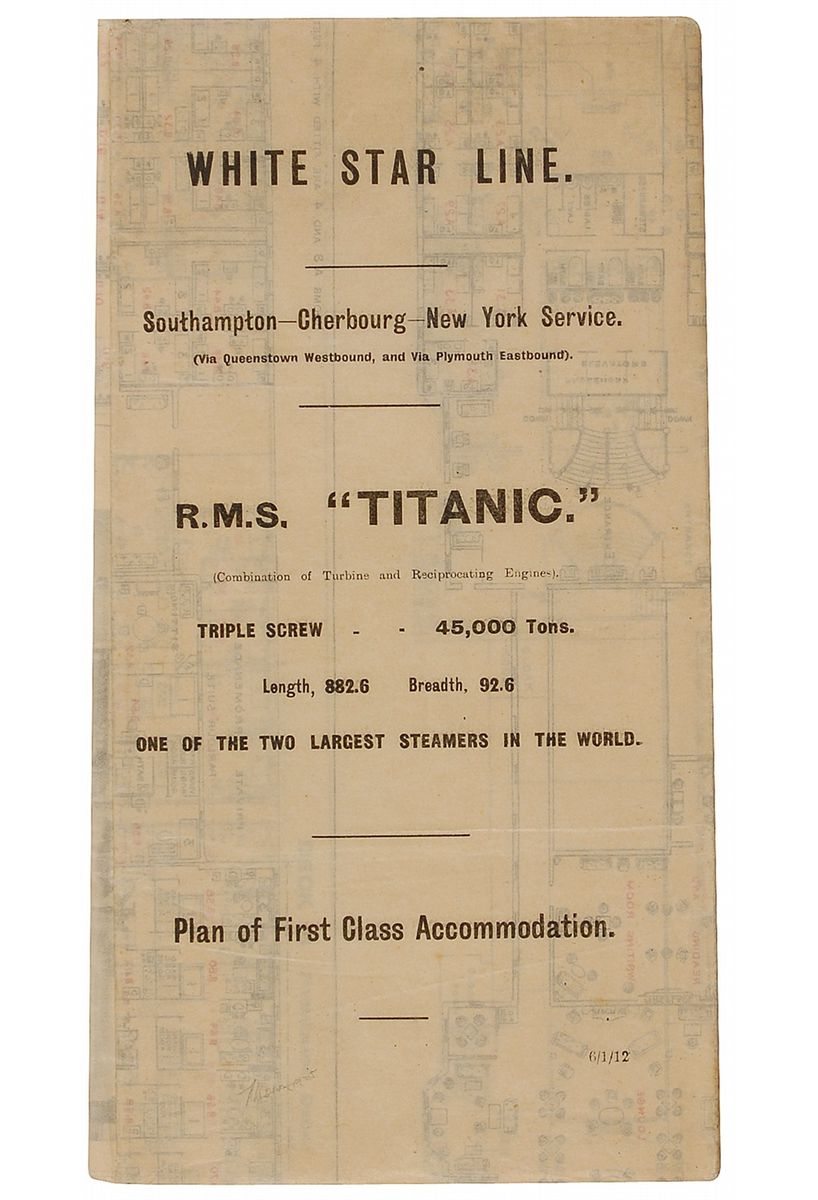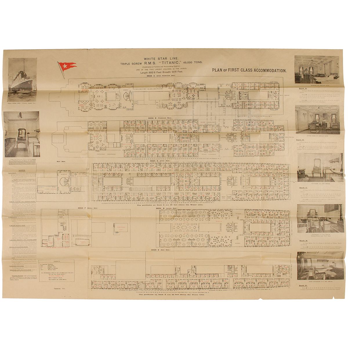 Printed promotional plan of the Titanic’s first class accommodations, measuring 5.25 x 10 folded and opening to an impressive 40 x 29. Outside panel is labeled “White Star Line. Southampton-Cherbourg- New York Service (Via Queenstown Westbound, and Via Plymouth Eastbound) R.M.S. 'Titanic.' (Combination of Turbine and Reciprocating Engines). Triple Screw - 45, 000 Length, 882.6 Breadth, 92.6 One Of The Two Largest Steamers In The World. Plan of First Class Accommodation." Inside, embellished with the famous White Star flag, shows the detailed ground plans of every First Class cabin over several decks; plus First Class Smoking Room, Lounge, Gymnasium, Restaurant, and Staircases, with 7 margin vignettes showing photographs of the rooms and a painting of the ship at sea; and with details of the facilities offered: “Restaurant. - In addition to the regular Dining Saloon there is a large modern a la carte Restaurant, on Deck B, where meals mat be obtained at any time between 8 a.m. and 11 p.m. at fixed charges… The Restaurant is under the management of the Company, who have appointed Mr. L. Gatti, late of Oddenino's Imperial Restaurant, London as manager. Turkish, Electric and Swimming Baths. - A fully-equipped Turkish Bath is situated on Deck F, consisting of the usual steam, hot temperate, shampooing, and cooling rooms… A Gymnasium, fully supplied with modern appliances, is situated on the Boat Deck, and is open for exercise by Ladies and Gentlemen during the same hours as the Baths… A Squash Racquet Court is provided on Deck F, and is in charge of a professional player. A Verandah Cafe and Palm Court situated on Deck A, where light refreshments are served.” Some small separations along fragile intersecting folds and a uniform shade of mild toning, otherwise fine condition.