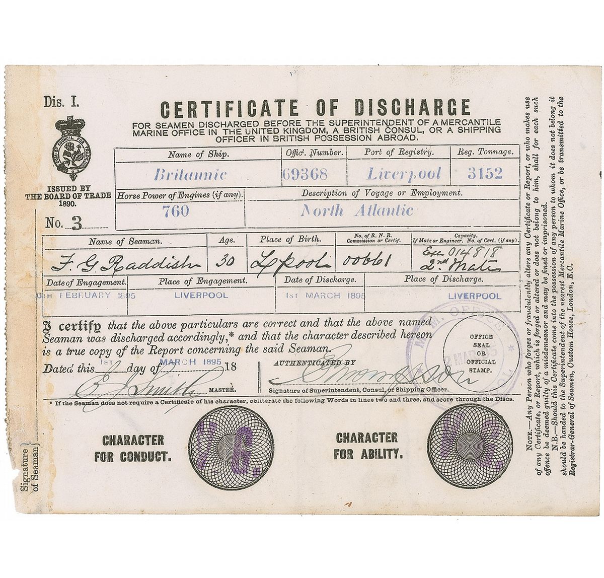 Joining the White Star Line in March of 1880, Edward Smith quickly rose in status, receiving his first command of a passenger vessel just seven years later. Earning his Extra Master’s Certificate, joining the Royal Navy Reserve, and developing a remarkable rapport with the line's elite passengers, many of whom would only travel under his care, he earned the nickname 'Millionaires' Captain,' a title that would help decide his future assignments. Stepping on board the SS Britannic for the first time in 1884 and returning to command it several times throughout his career—including most of 1891–1895—Smith came to know the waters between the UK and New York like the back of his hand. His success on the Britannic helped him secure future commands of the newest and most impressive ships—the Baltic, the Adriatic, the Olympic, and finally, the Titanic. An incredibly rare document—only the second we have offered—signed by the Captain as his career steadily climbed.