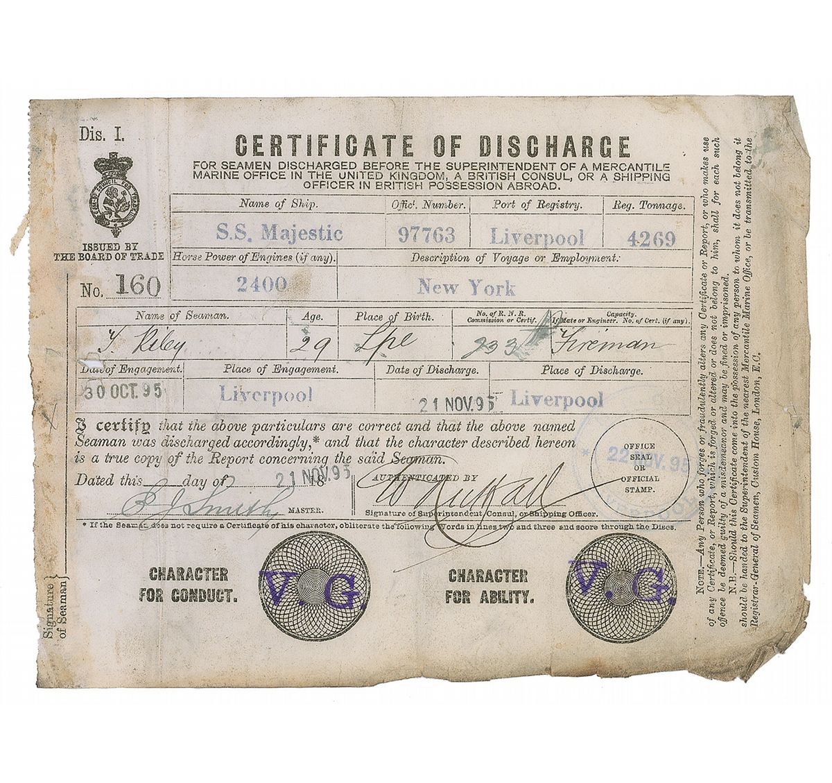 Excessively rare DS, signed “E. J. Smith,” one page, 7.75 x 6, stamp-dated November 21, 1895. Certificate of discharge issued to T. Riley, who served as a fireman aboard the SS Majestic from October 30, 1895, to November 21, 1895, and was discharged in Liverpool. Printed near the bottom is a certification statement which reads, “I certify that the above particulars are correct and that the above named Seaman was discharged accordingly, and that the character described hereon is a true copy of the Report concerning the said Seaman.” Signed at the conclusion of the statement by Smith as the vessel’s master, and countersigned by a shipping representative. Discharge also bears two “V.G.” stamps in areas for character of conduct and ability, as well as an office stamp. In very good condition, with edge soiling, creasing, and chipping to edges, and a few small holes to edges. The future Titanic captain served as captain of the Majestic beginning in 1895, a position he held for the following nine years. An incredibly scarce autograph, just the fourth one we have ever offered.