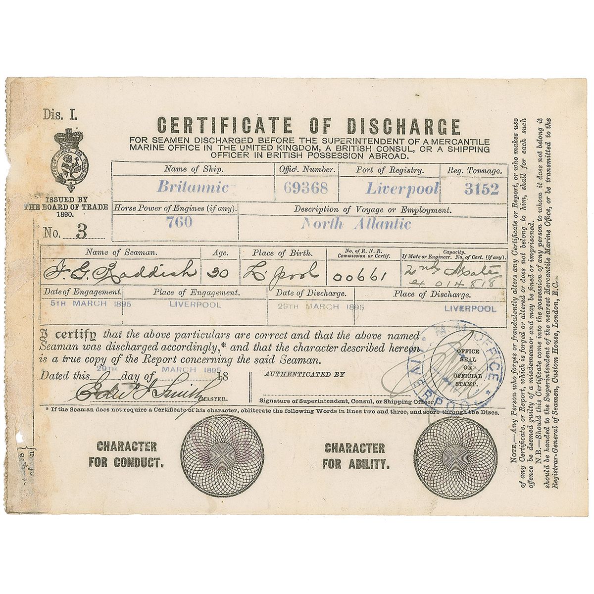 Scarce and highly sought after DS, signed “Edwd J. Smith,” one page, 7.75 x 6, stamp-dated March 29, 1895. A certificate of discharge issued to T. G. Raddish, a second mate on board the Britannic. The document states Raddish served aboard the vessel from March 5, 1895, until March 29, 1895, and was discharged in Liverpool. Printed near the bottom is a certification statement which reads, “I certify that the above particulars are correct and that the above named Seaman was discharged accordingly, and that the character described hereon is a true copy of the Report concerning the said Seaman.” Signed at the conclusion of the statement by Smith as the vessel’s master, and countersigned by a shipping representative. The discharge also bears two “V.G.” stamps in areas for character of conduct and ability. Some scattered light creases and wrinkles, and some toning along left edge from adhesive, otherwise fine condition. Smith joined the White Star Line in 1880 and assumed command of the Britannic, a post he held until May of 1893, when he left to briefly command the Adriatic. As he rose in seniority, some transatlantic passengers would sail only on ships captained by Smith. The Britannic was a White Star Line vessel launched in 1874, and able to cross the Atlantic in slightly more than seven days. In 1899, it was requisitioned by the British government and used as a troop transport during the Boer War. An exceedingly rare document, signed by Smith as his career ascended towards his fateful command of the Titanic.