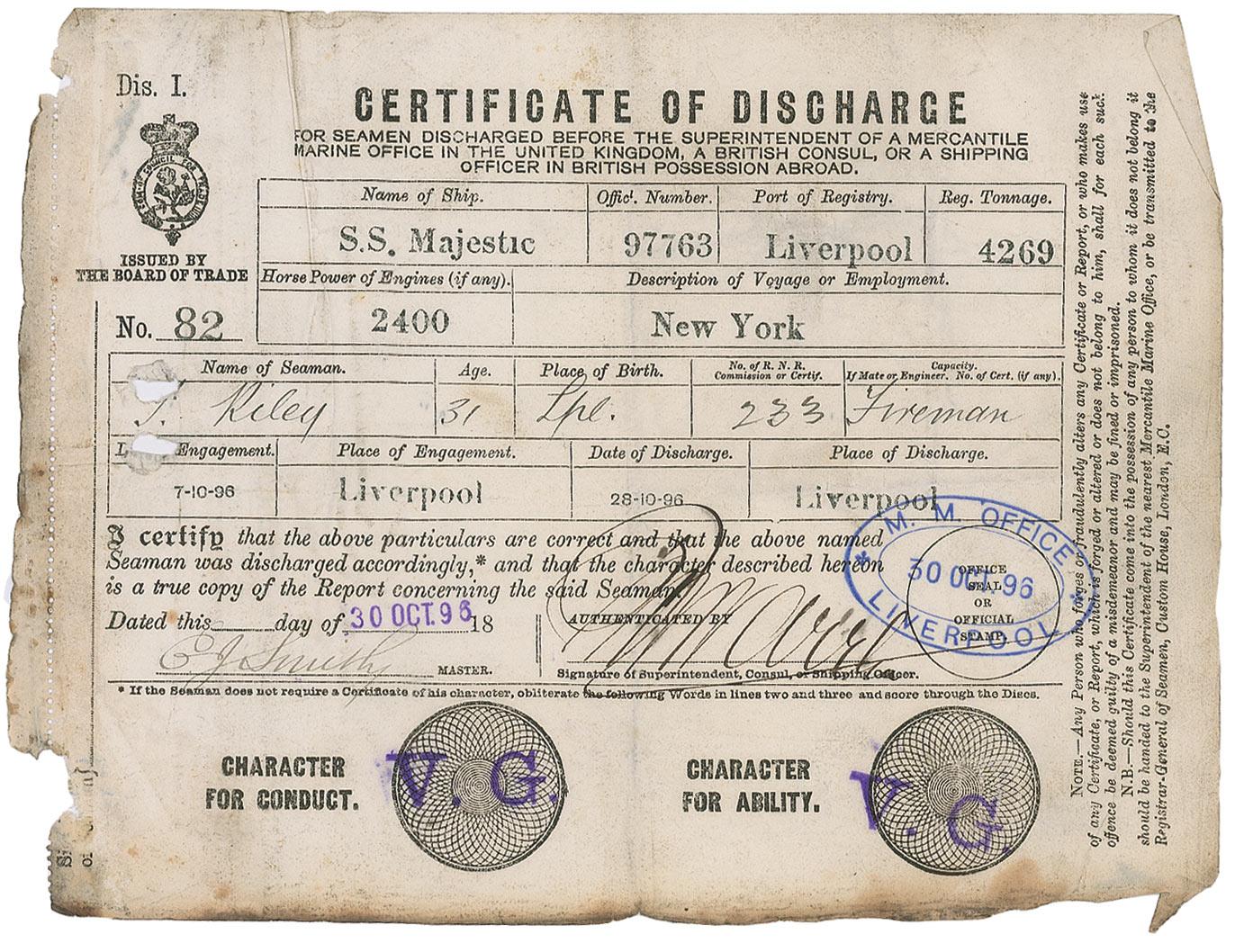 English naval officer (1850–1912) who was the officer in command of the RMS Titanic and died when the ship sank. DS, signed “E. J. Smith,” one page, 8 x 6, October 30, 1896. A certificate of discharge issued to T. Riley a fireman aboard the S.S. Majestic. Document states Riley served aboard the vessel from October 7–28, 1896, and was discharged in Liverpool. Printed near the bottom is a certification statement which reads, “I certify that the above particulars are correct and that the above named Seaman was discharged accordingly, and that the character described hereon is a true copy of the Report concerning the said Seaman.” Signed at the conclusion of the statement by Smith as the vessel’s master, and countersigned by a shipping representative. Discharge also bears two “V.G.” stamps in areas for character of conduct and ability. Central vertical fold, scattered creasing and wrinkling, soiling and toning, a bit heavier to edges, two small holes to left side of sheet, Liverpool office stamp to lower right, paper loss to left edge, and some light scorch marks along extreme bottom edge, otherwise very good condition.