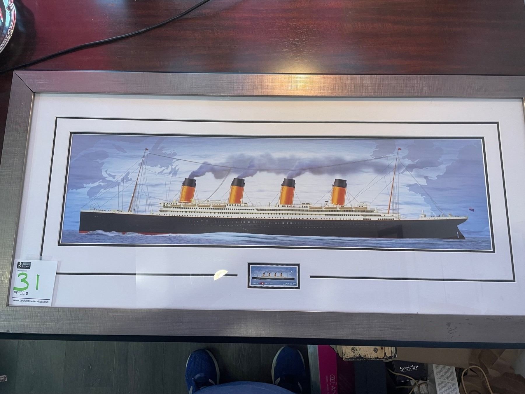Framed Painting of the Titanic. Includes a $1 Canadian Stamp issued 2012.