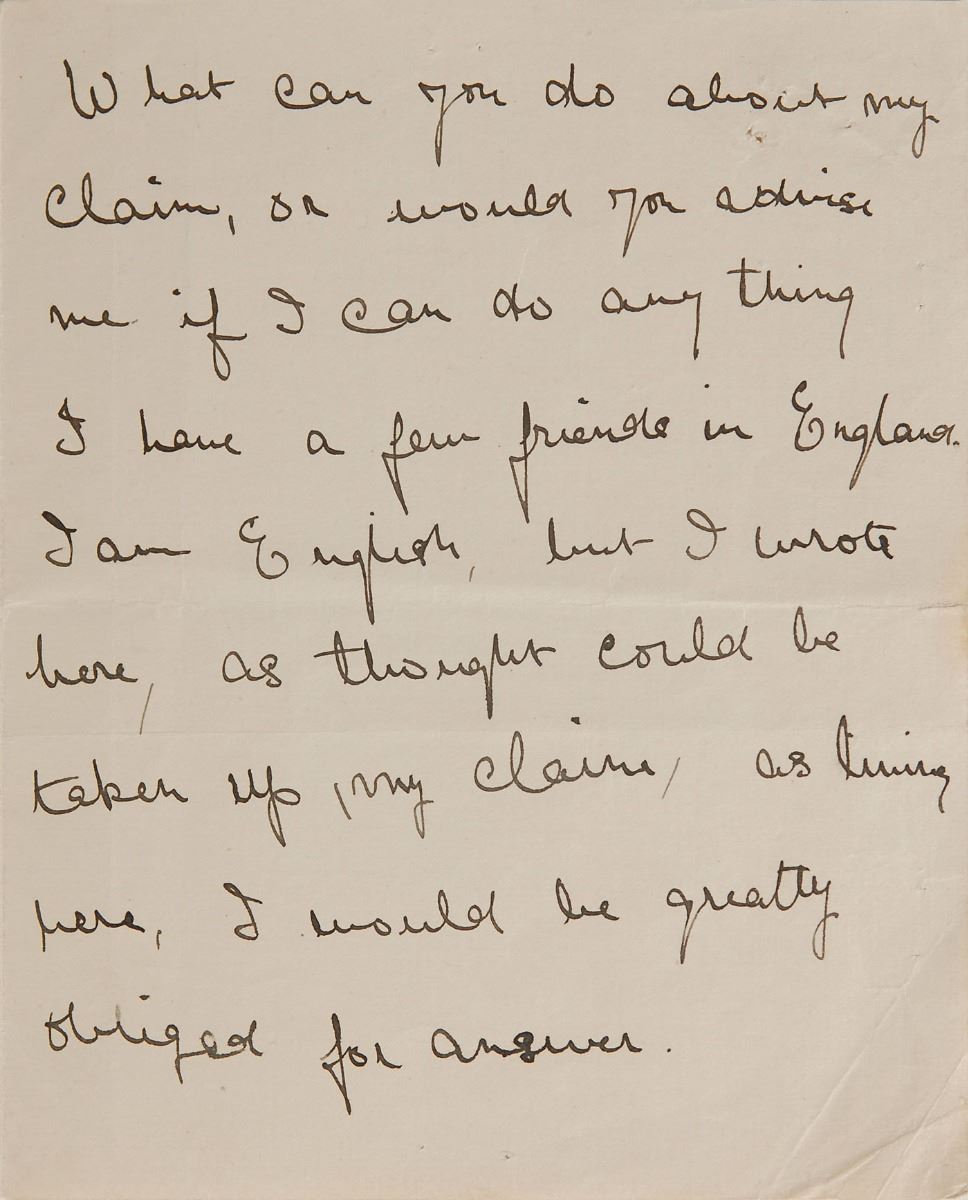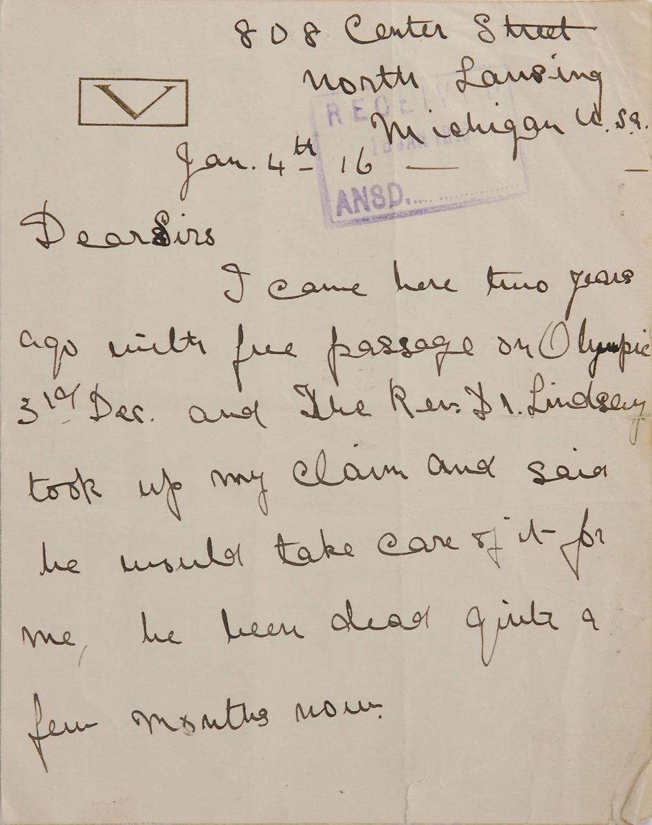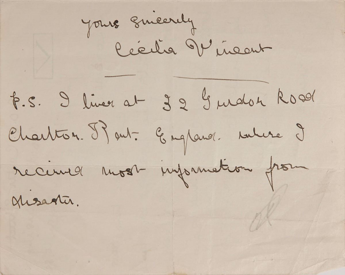 ALS signed by Frederick Ware's widow, “Cecilia Vincent,” three pages on two adjoining sheets, 5 x 6.5, personal letterhead, January 4, 1916. Letter to the White Star Line seeking restitution for the loss of her husband, Frederick Ware, in the Titanic disaster. In full: "I came here two years ago with free passage on Olympic 31st Dec. and The Rev. D. Lindsay took up my claim and said he would take care of it for me, he has been dead quite a few months now. What can you do about my claim, or would you advise me if I can do any thing I have a few friends in England. I am English, but I wrote here, as thought could be taken up my claim, as living here, I would be greatly advised for answer." She adds a postscript, "I lived at 32 Gurdon Road Charlton, Rent, England, where I received most information from disaster." In very good to fine condition, with scattered creasing and intersecting folds. Both born in England, the Wares emigrated to Lansing, Michigan, in 1909, where Frederick found work at an automobile factory. Presumably returning to Michigan from a trip abroad, Frederick Ware boarded the Titanic alone at Southampton as a third-class passenger; he perished in the disaster, and his body was never identified.
