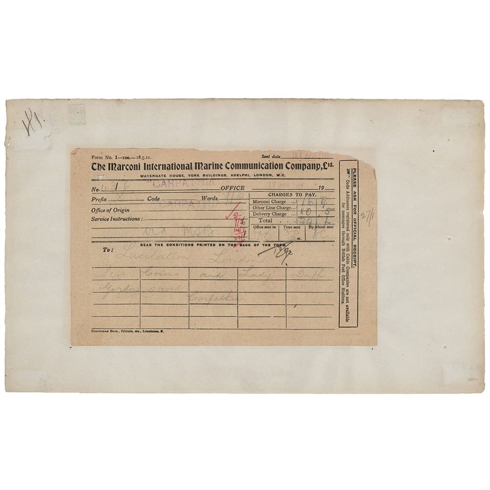 The second, written in pencil on a Marconi form, reads: “Lucilation London, Sir Cosmo and Lady Gordon saved, Carpathia.†The sheet is numbered “43/6,†lists a charge total of “27/1,†with service instruction “Via MSB,†sent by “DDB†to “HC†[Harold Cottam]. Fashion designer Lucy Duff-Gordon and her husband Sir Cosmo Duff-Gordon, traveling first class, were a leading society couple of the day, and after rescue they were much criticized. During evacuation, the Duff-Gordons were lowered into a 40-man lifeboat holding just 12 people—most of them crewmen. Accusations were made that Sir Cosmo bribed sailors to ignore people in the water. Telegraph operator Harold Cottam was a British wireless operator on the RMS Carpathia who fortuitously happened to receive the distress call from the sinking Titanic on April 15, 1912. His decision to awaken Captain Arthur Henry Rostron and relay the Titanic's message allowed the Carpathia to arrive at the scene hours before any other ship, consequently saving hundreds of lives. In overall fine condition, with light overall wrinkling.