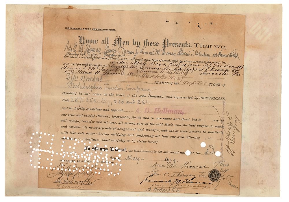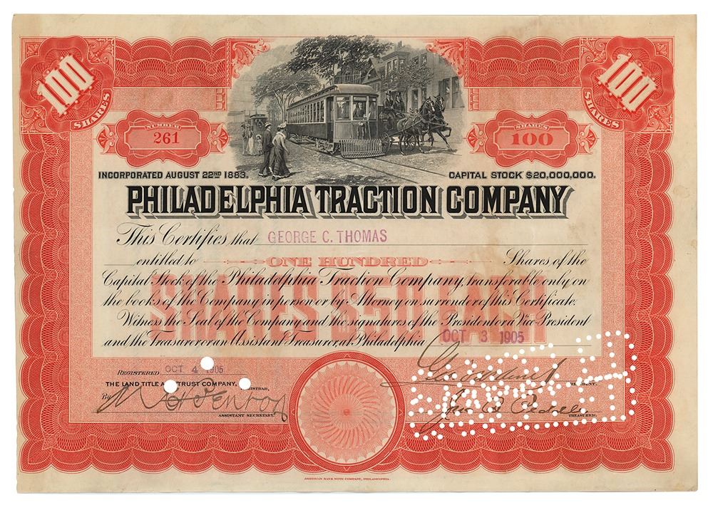 Partly-printed DS, signed "Geo. D. Widener," one page, 11.5 x 8, October 3, 1905. Stock certificate issued to George C. Thomas for 100 shares in the Philadelphia Traction Company, signed at the conclusion by Widener as the company's president. In fine condition, with cancelation holes to the signature area.
