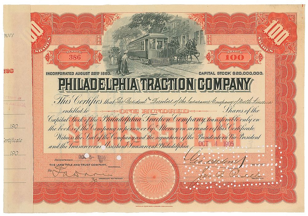 Wealthy Philadelphia businessman who perished in the Titanic disaster (1861–1912). Partly-printed DS, signed “Geo. Widener,” one page both sides, 11.5 x 8, stamp-dated October 4, 1905. Stock certificate for 100 shares of the Philadelphia Traction Company, signed at the conclusion by Widener. In very good condition, with multiple vertical folds, numerous cancellation holes affecting the signature, and the transfer slip trimmed off.