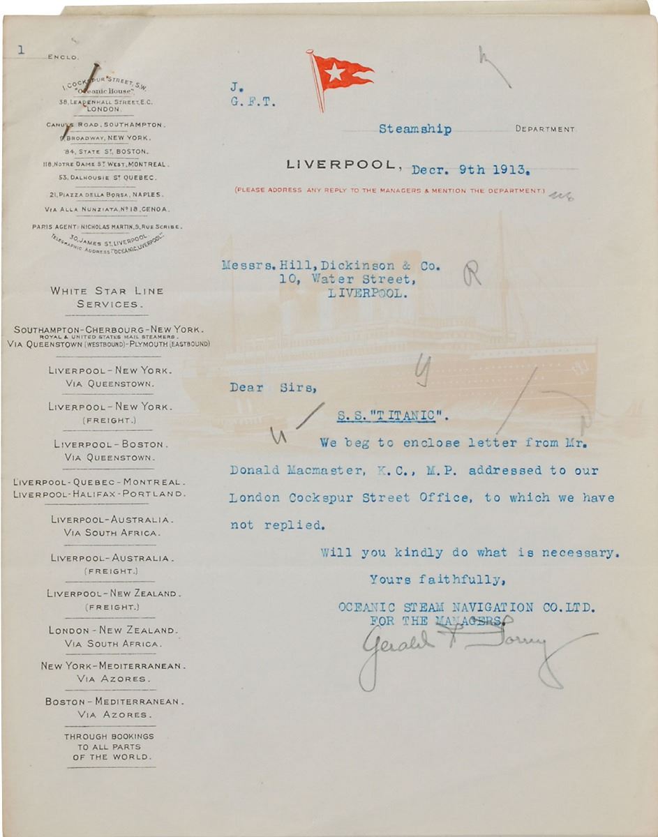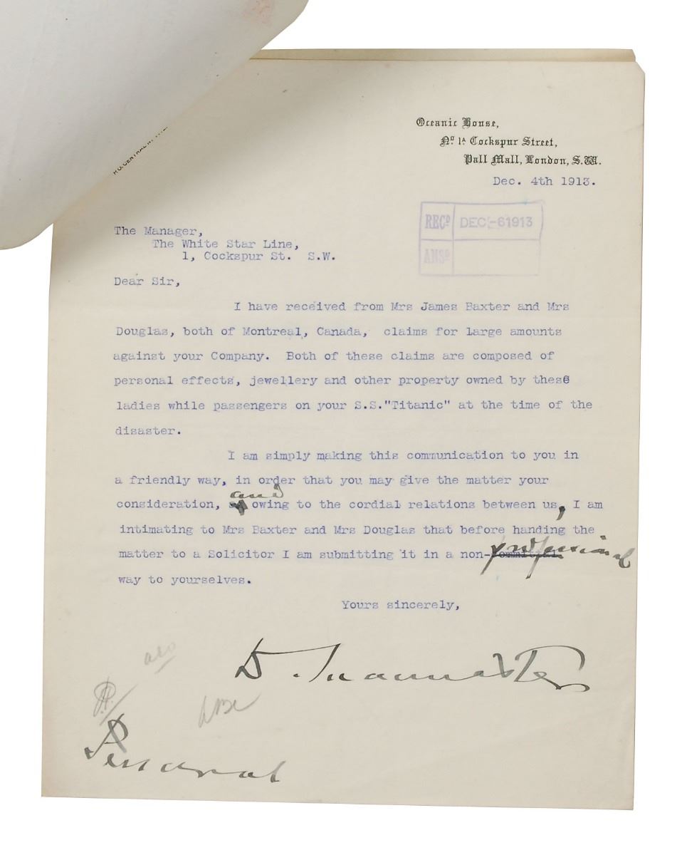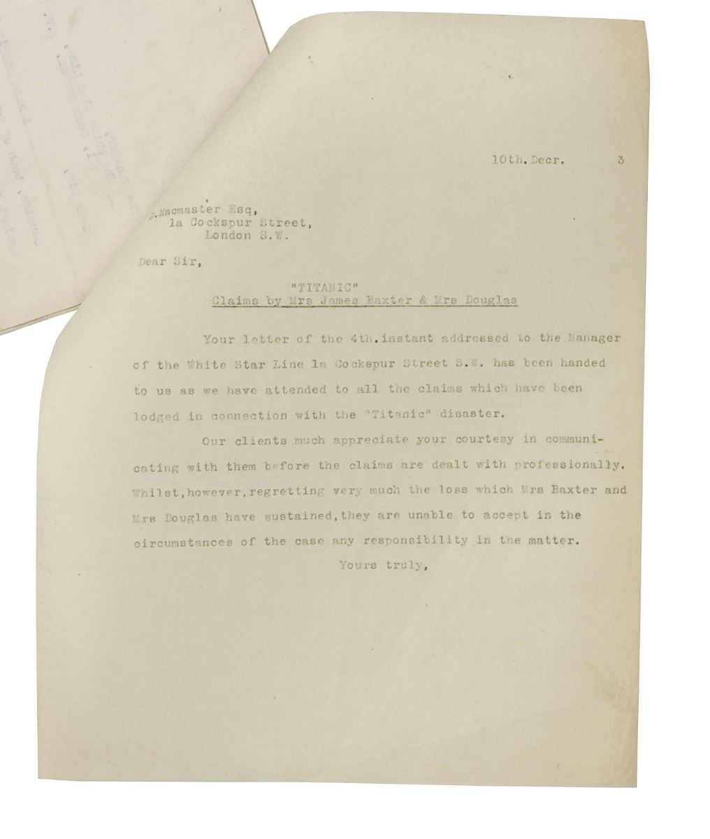 Collection of three letters related to an insurance claim by Helene Baxter for losses in the Titanic disaster, consisting of a letter from her lawyer, a letter by the White Star Line, and a carbon copy of their law firm’s response. The initial TLS is from her lawyer Donald Macmaster to the White Star Line, one page, December 4, 1913, in part: “I have received from Mrs. James Baxter and Mrs. Douglas, both of Montreal, Canada, claims for large amounts against your Company. Both of these claims are composed of personal effects, jewelry and other property owned by these ladies while passengers on your S.S. ‘Titanic’ at the time of the disaster.” The White Star Line forwards the letter to their law firm, Messrs. Hill, Dickinson & Co., in a TLS of December 9th, in headed “S.S. ‘Titanic,’” in part: “We beg to enclose letter from Mr. Donald Macmaster…to which we have not replied. Will you kindly do what is necessary.” The final piece of correspondence is a carbon copy of the firm’s reply to Macmaster, in part: “We have attended to all the claims which have been lodged in connection with the ‘Titanic’ disaster. Our clients much appreciate your courtesy…Whilst, however, regretting very much the loss which Mrs. Baxter and Mrs. Douglas have sustained, they are unable to accept in the circumstances of the case any responsibility in the matter.” In fine condition.