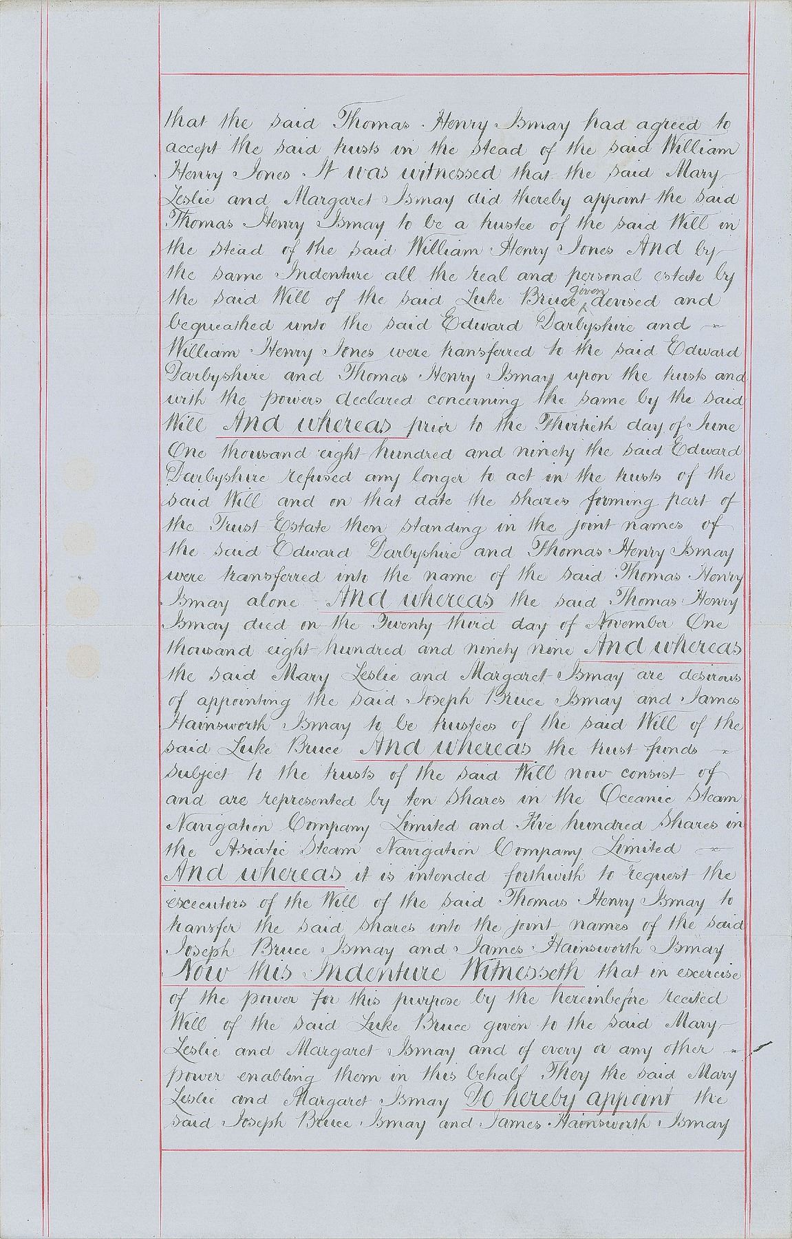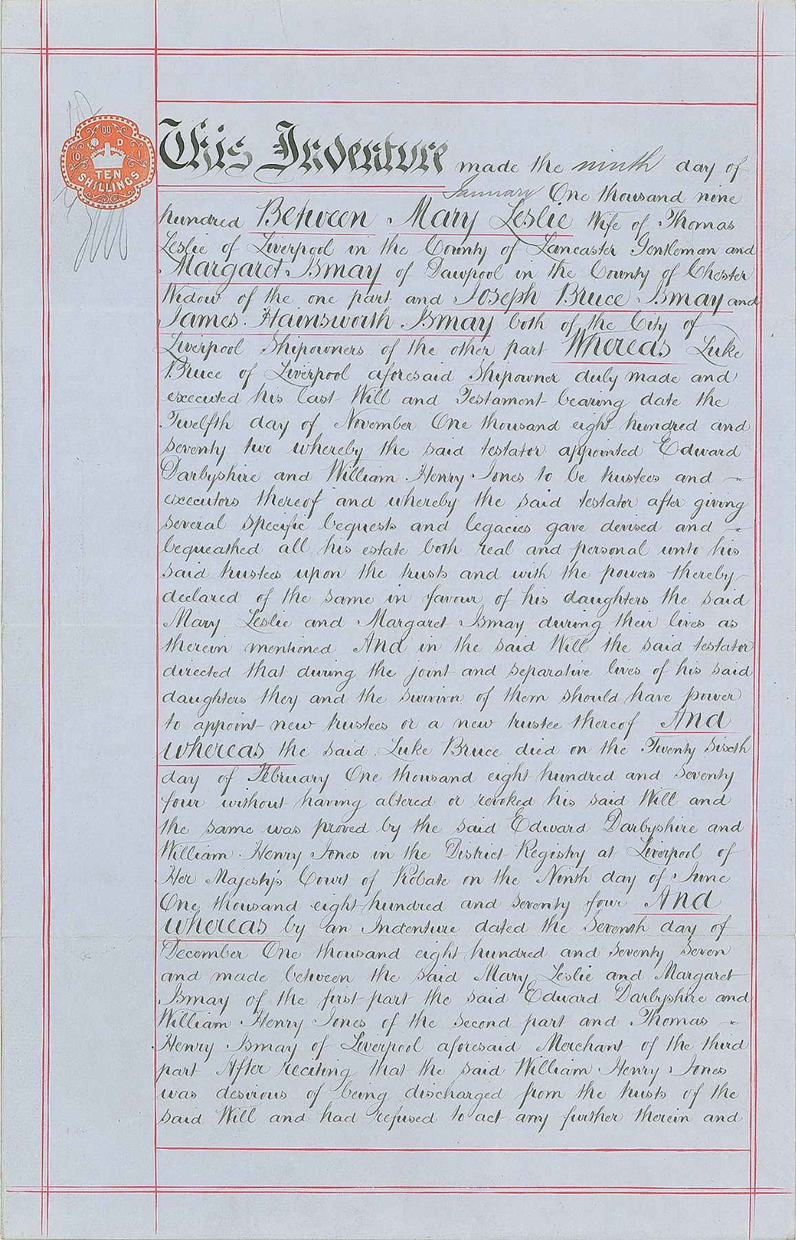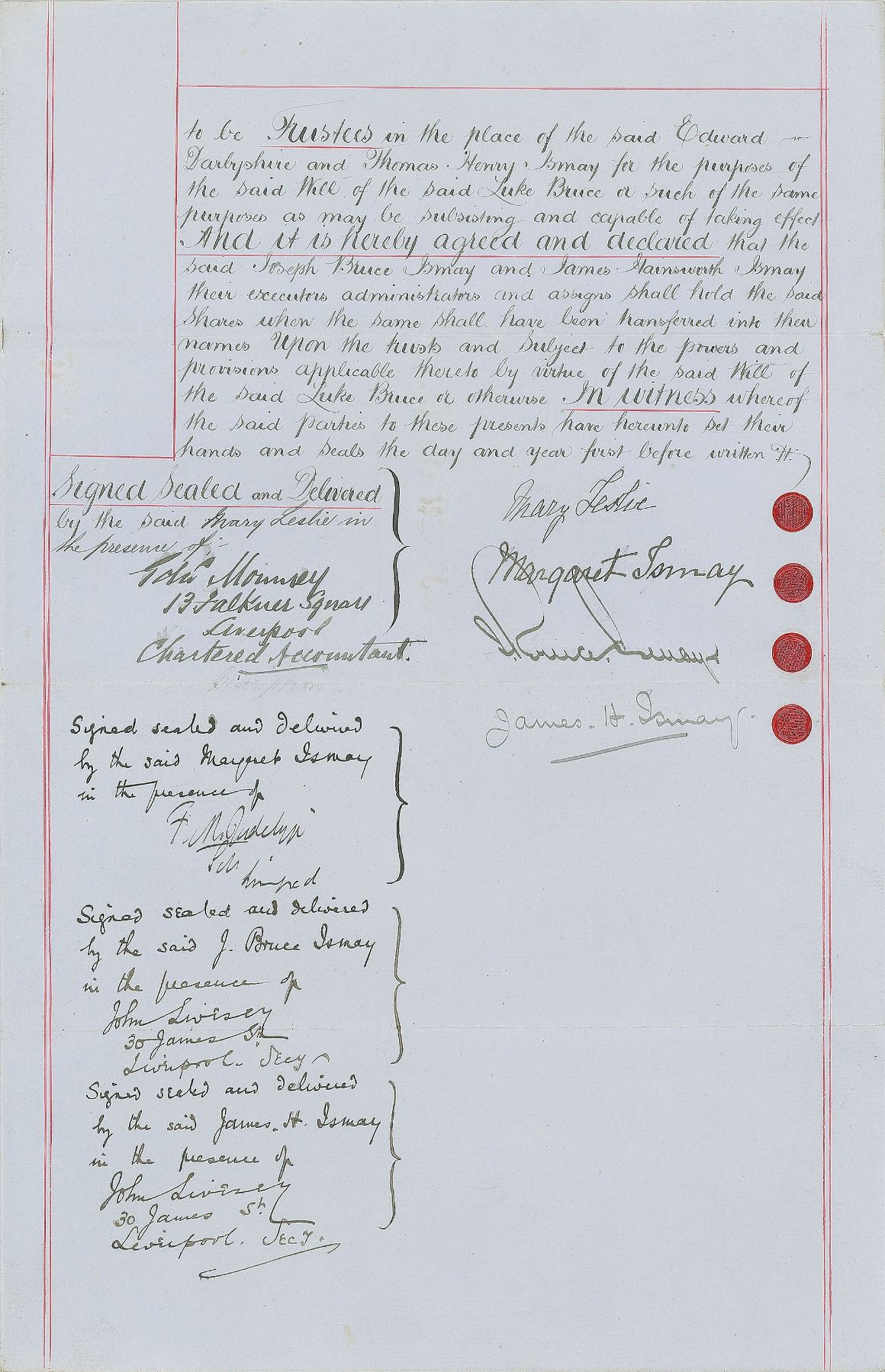 A superb, historic document signed by J. Bruce Ismay, whose family was rooted in the shipping industry: his paternal grandfather, Thomas Ismay, was the founder of the White Star Line; and his maternal grandfather, Luke Bruce, was a noted shipowner. In this document, Luke Bruce's daughters, Mary Leslie and Margaret Ismay, name Margaret's sons James and J. Bruce as trustees of the Bruce family trust, which held shares of the Oceanic Steam Navigation Company and Asiatic Steam Navigation Company. Most notably, the "Oceanic Steam Navigation Company Limited" was the formal name of the White Star Line, of which J. Bruce Ismay had become chairman in 1899 after the death of his father. Inheriting additional shares of the line via his grandfather's trust would have afforded Ismay even greater control over the company; he also served as chairman of the Asiatic Steam Navigation Company. A beautiful and important Titanic-related piece.