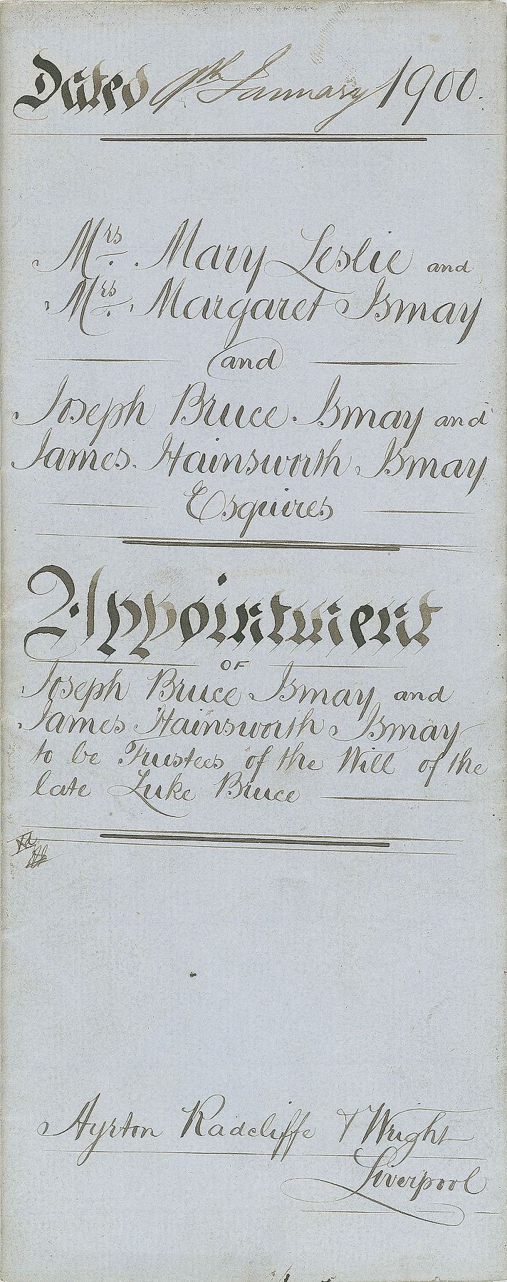 Includes a large vellum document marked "Probate of the Will of Mr. Luke Bruce, Dated the 9th June 1874," one page, 27 x 20.5, featuring an extract of the "Last Will and Testament" of Luke Bruce. The will names J. Bruce Ismay specifically, "I give to my Grandson Joseph Bruce Ismay my Watch, Jewellery and the Silver Salver presented to me by my friends," while the bulk of his fortune was to be placed in the trust. A document from Her Majesty's Probate Court certifying the will is attached at the bottom, and an impressive embossed paper seal is suspended from the large document. In overall fine condition.