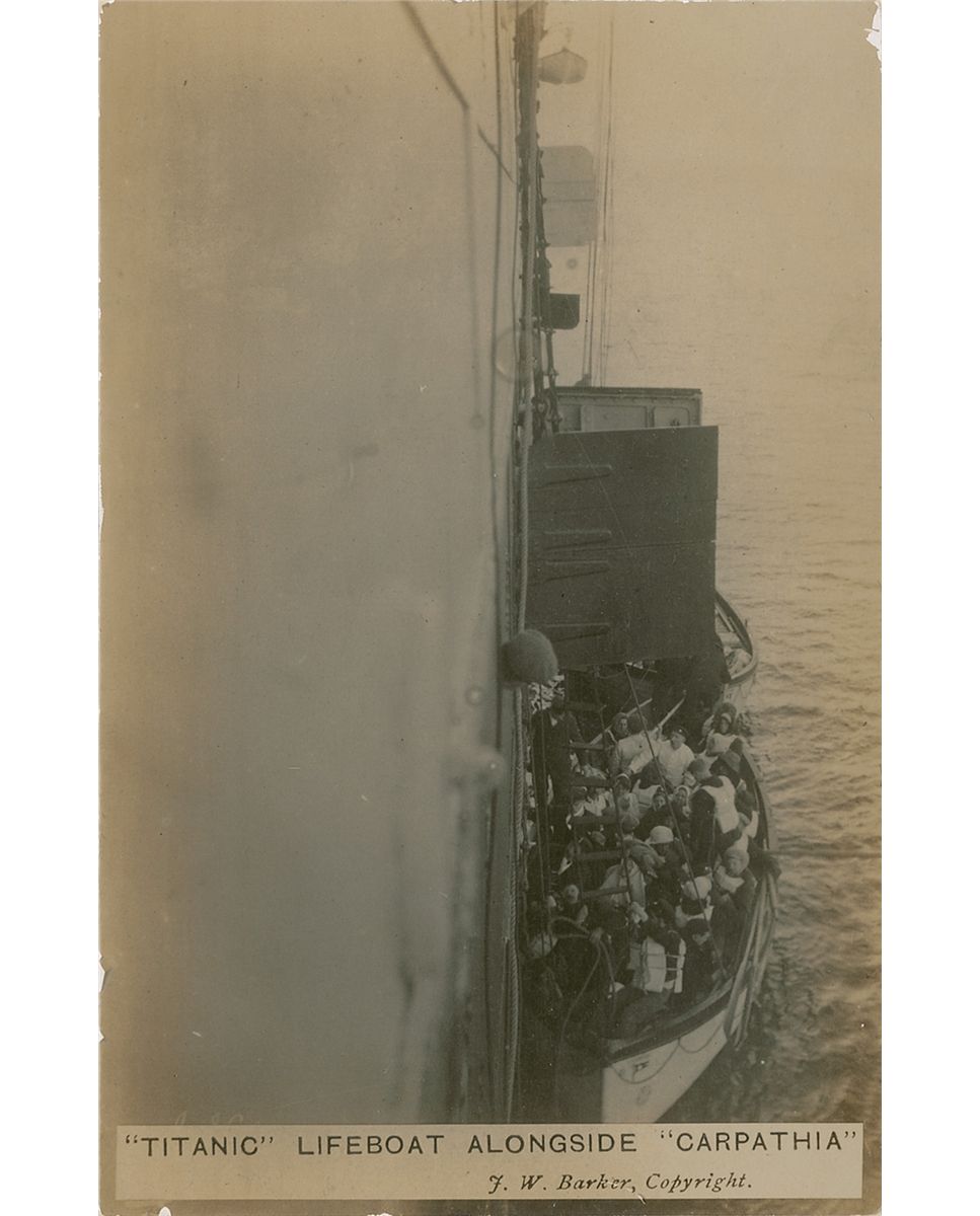 Unused real photo postcard by J. W. Barker, featuring one of the Titanic’s lifeboats unloading rescued passengers onto the Carpathia, captioned at the bottom: "‘Titanic’ Lifeboat Alongside ‘Carpathia.’” In fine condition, with mild toning to the borders.