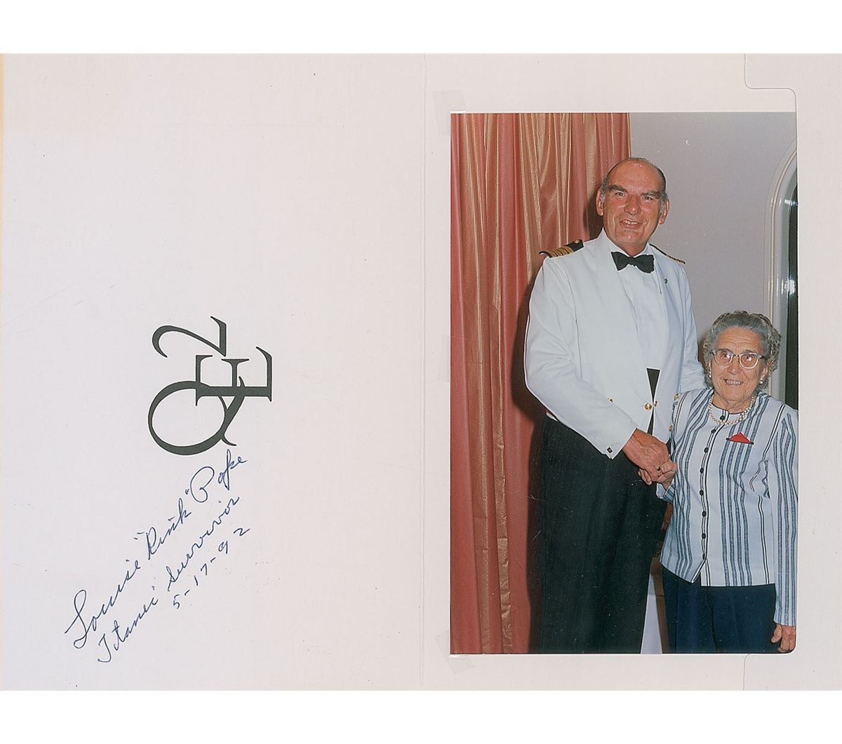 Color glossy 4.5 x 7 photo of Pope posing with the captain of the QE2, housed in its original 5.25 x 8.25 presentation folder, signed in blue ballpoint on the inside cover of the folder and “Louise ‘Kink’ Pope, Titanic Survivor 5-17-92.” In fine condition.