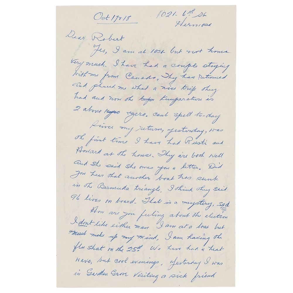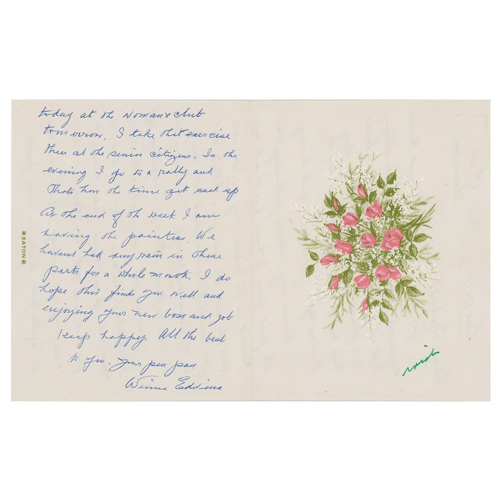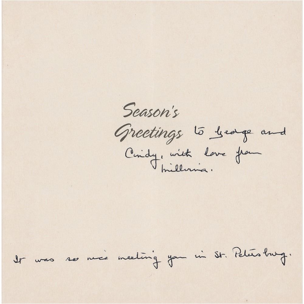 Two items from Titanic survivors Edwina MacKenzie and Millvina Dean: an ALS signed “Winnie Edwina,†one page both sides, 5 x 7.75, October 17 and 18, 1976, handwritten letter to Robert Forrest, in part: “Since my return yesterday, was the first time I have had Rusti and Howard at the house. They are both well and she said she owes you a letter. Did you hear that another boat has sunk in the Bermuda triangle. I think they said 96 lives on board. That is a mystery. Sad.â€; and a Christmas card that measures 11 x 5.5 open, signed and inscribed inside in black ballpoint, “To George and Cindy, with love from Millvina, It was so nice meeting you in St. Petersburg.†In overall fine condition.