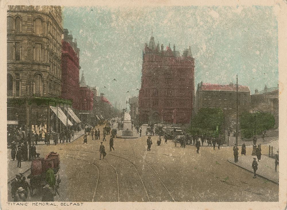 British hand-colored postcard featuring an artist’s depiction of the Belfast Titanic memorial and surrounding cityscape, captioned at the bottom: "Titanic Memorial, Belfast.” Postmarked February 22, 1921, in Belfast, and bears a letter in ink, in part: “We all are going on all right, hoping you all are the same.” Some surface wear and light corner tip creases, otherwise fine condition.