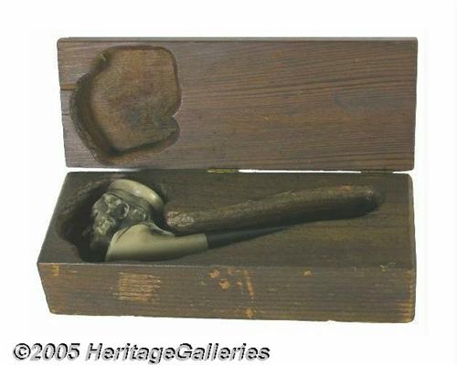 <B>Titanic Memorial Pipe</B></I> The bowl in the form of a sailor with the ill-fated ocean liner's name across his cap. Beautifully made pipe in its original wooden case, marked with the name of the Edmond Pipe Co., Eugene, Oregon. Pipe is near-mint, box has old, scuffed patina. Length 5.5", the box 2.5" x 7". Lot:253