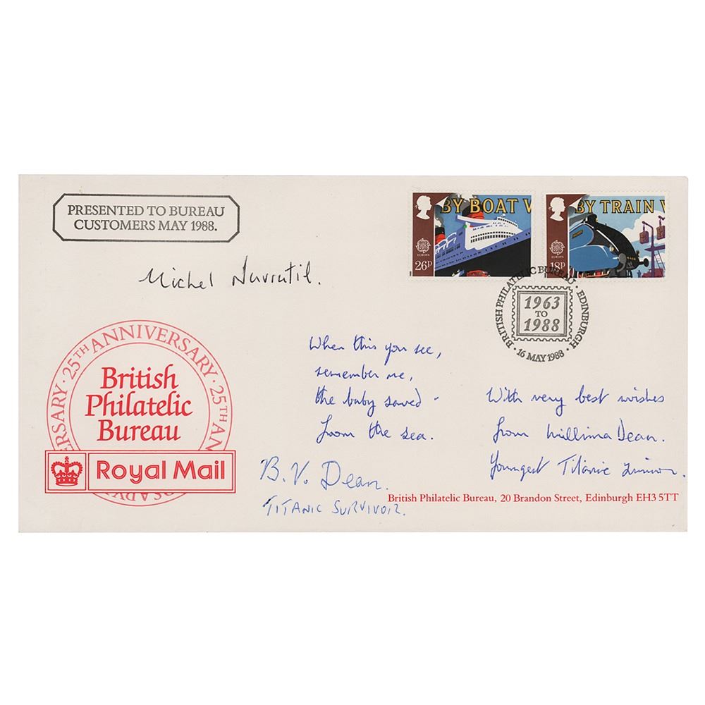Royal Mail commemorative cover, 8.5 x 4.5, with a cachet honoring the 25th Anniversary of the British Philatelic Bureau, postmarked in Edinburgh, Scotland, on May 16, 1988, signed in blue or black ballpoint by three survivors of the Titanic sinking: Michel Navratil, Bertram Vere Dean, who adds “Titanic Survivor,” and Millvina Dean, who adds “Youngest Titanic survivor” and a brief poem, “When this you see, remember me, the baby saved, from the sea.” In very fine condition.