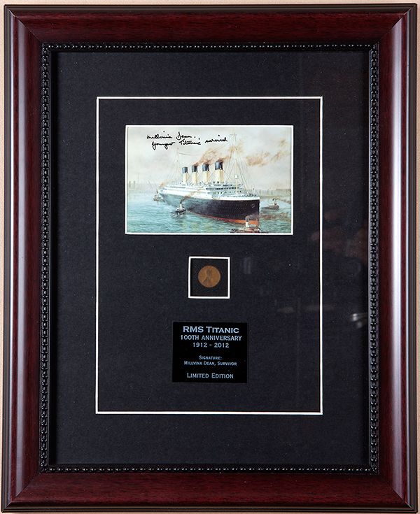 [titanic] Millvina Dean, the Youngest Survivoe. Color postcard of the Titanic signed "Millvina Dean, youngest Titanic surviver." Part of a limited edition to commemorate the 100th anniversary of the sinking of the Titanic. Matted with a 1912 wheat penny and framed to13¾ x 16¾." An infant of only 9 weeks old, Millvina Dean was one of the 705 fortunate passengers rescued from the legendary steamship.