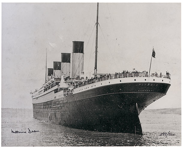 Limited edition glossy 10 x 8 photo of the ill-fated ocean liner, #297/500, signed in black felt tip “Millvina Dean.” In fine condition. Accompanied by a photo taken at the time of the signing.