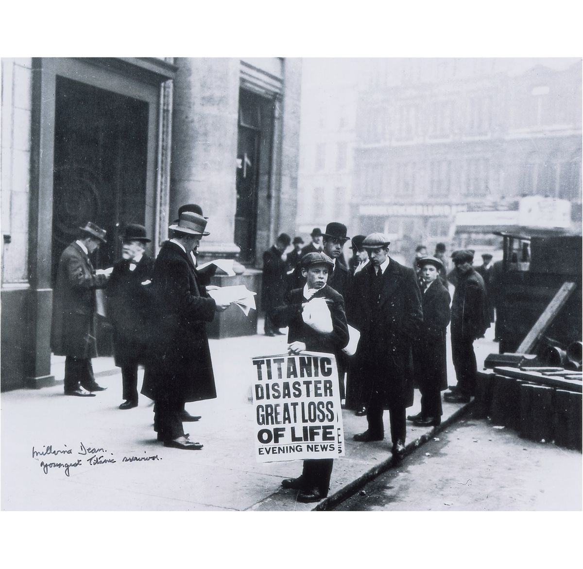 Glossy 14 x 11 photo of a newsboy holding a placard proclaiming the Titanic disaster, signed in black felt tip, “Millvina Dean, youngest Titanic survivor.” In fine condition.