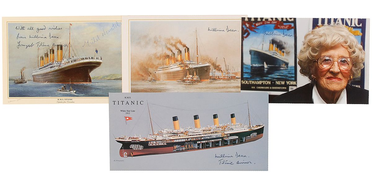 Four color photos, three cardstock and one satin-finish, ranging in size from 6 x 4 up to 7 x 4.5, each signed in black ink “Millvina Dean,” adding “Titanic survivor,” to two photos, with one photo also signed by Michel Navratil. In fine condition.