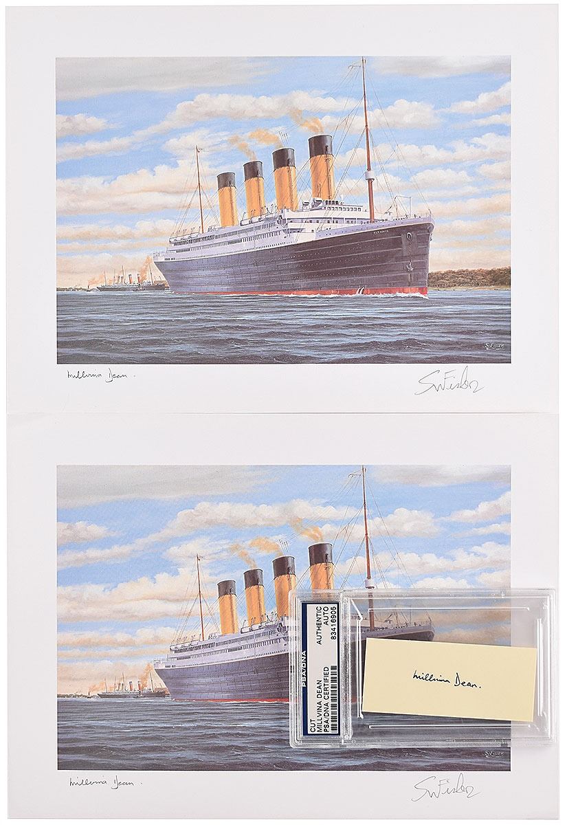 Three items: two identical color 11 x 8 prints of Simon N. Fisher's painting of the Titanic, each signed in the lower border in pencil by Millvina Dean and Simon N. Fisher; and a felt tip signature, "Millvina Dean," on an off-white 3.25 x 1.5 slip, encapsulated in a PSA/DNA authentication holder. In overall very fine condition.