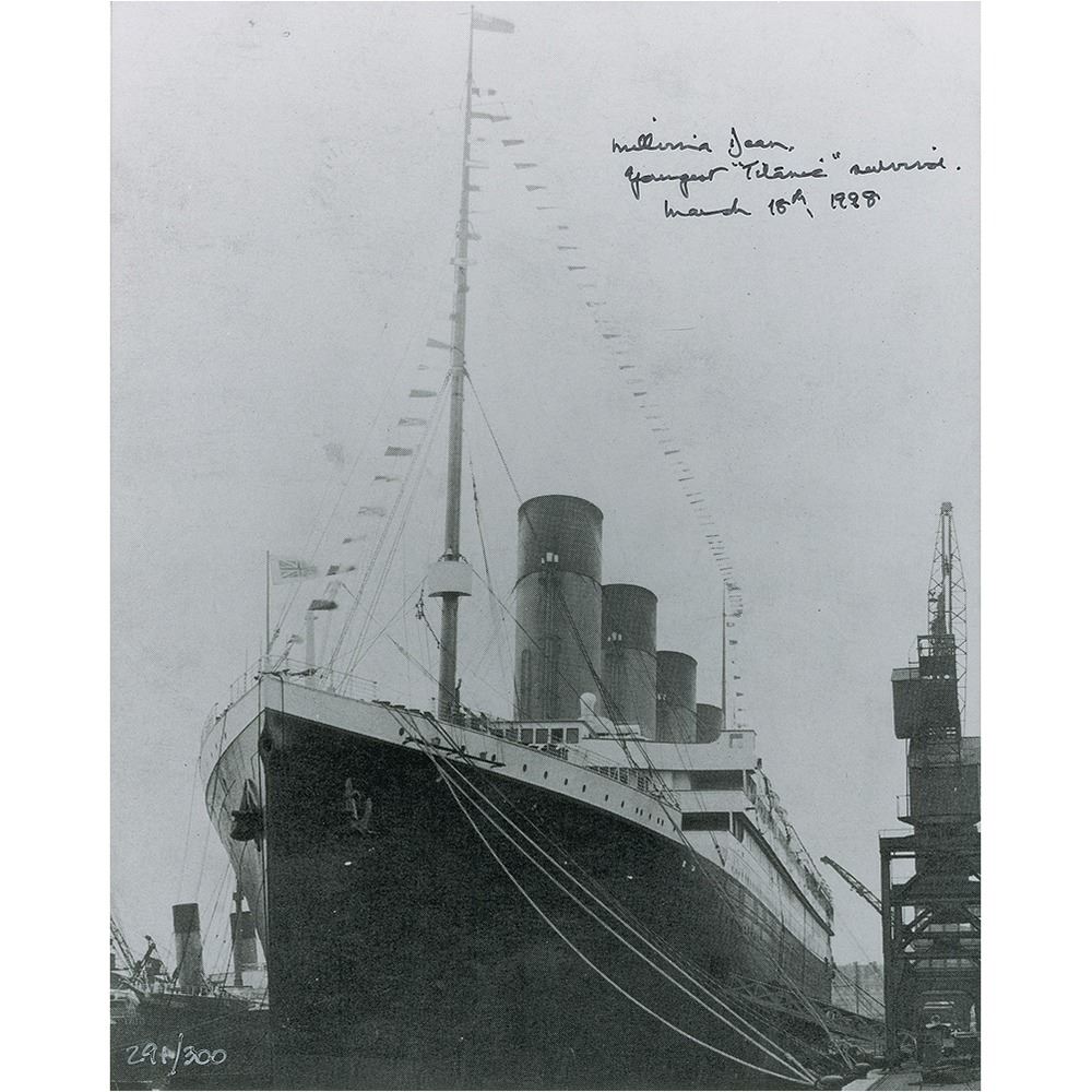 Limited edition glossy 8 x 10 photo of the Titanic docked in Southampton, numbered 291/300, signed in black felt tip, “Millvina Dean, Youngest ‘Titanic’ survivor, March 15th, 1998.” In fine condition. Accompanied by a certificate of authenticity and by a photo of Dean taken at the time of signing.