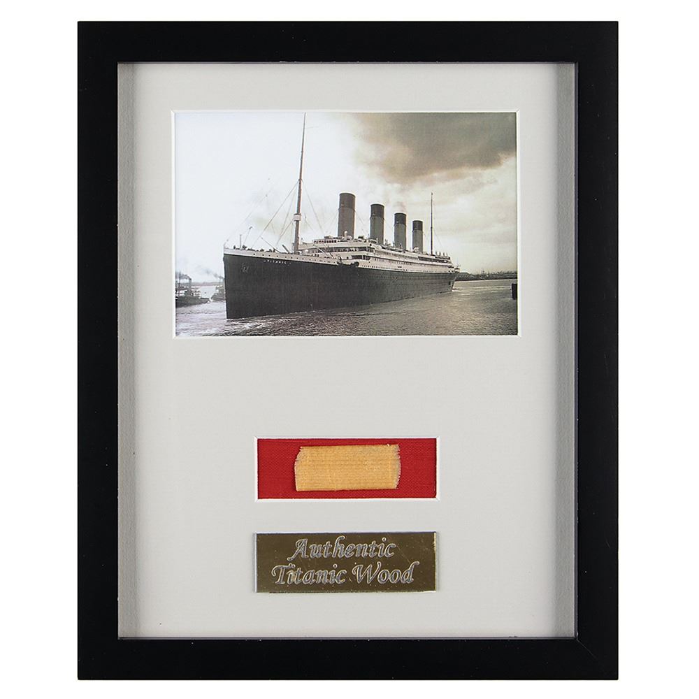 A thin 1.75˝-long sliver of wood, originally part of the ship's oak wheelhouse door, recovered from the Atlantic Ocean after the sinking of the Titanic. Salvaged from the debris by the Minia's carpenter William Parker, he crafted a liquor cabinet from the door and other pieces of wreckage and presented it to the ship's chief officer James Adams. Matted and framed with a portrait of the Titanic to an overall size of 10 x 12. Accompanied by a copy of a condition and information report for the liquor cabinet from Titanic—The Exhibition, stating the cabinet was made by Parker; and a message board post from noted Titanic expert Steve Santini, a previous owner of the cabinet, stating the wood comes from the wheelhouse door. In fine condition. Oak recovered from the wreckage is quite desirable as it was used for the more high-class areas of the ship.