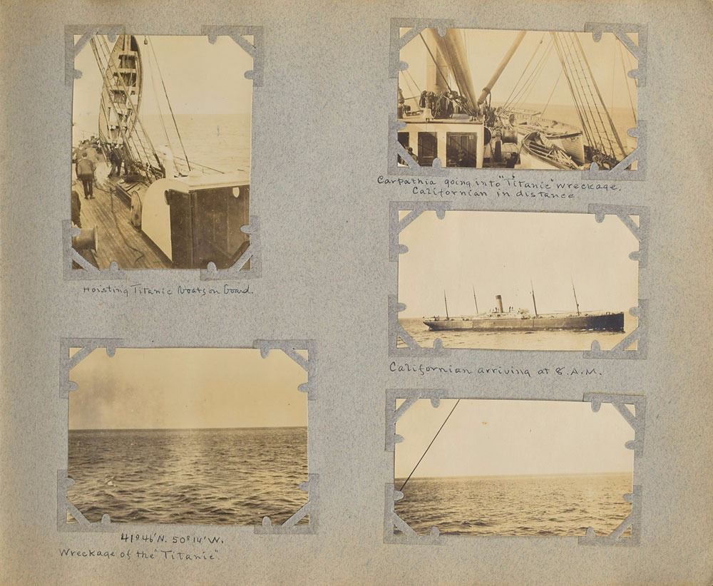 Incredible photograph album belonging to Louis M. Ogden, a New York socialite aboard the RMS Carpathia during the Titanic disaster who helped to photograph, document, and assist the survivors. The album consists of over 500 first-generation glossy and matte-finish photos, each removably corner-mounted and displayed on 12 x 10 album pages bearing handwritten ink notations by Ogden. The photographs document the globe-spanning expedition he and his wife Augusta took over the course of 1911 and 1912, visually recording their trips to Algiers, the Sahara, Spain, Italy, Argentina, Gibraltar, Switzerland, Greece, and Austria. The album is highlighted by an assortment of 50 photos, ranging in size from 2.75 x 3 to 4.75 x 6.75, which chronicle life aboard the Carpathia and the mid-April 1912 rescue of the Titanic survivors. While condition of the album itself is rough (missing spine and cover, fragile pages, etc), the photos themselves are in overall fine condition.
