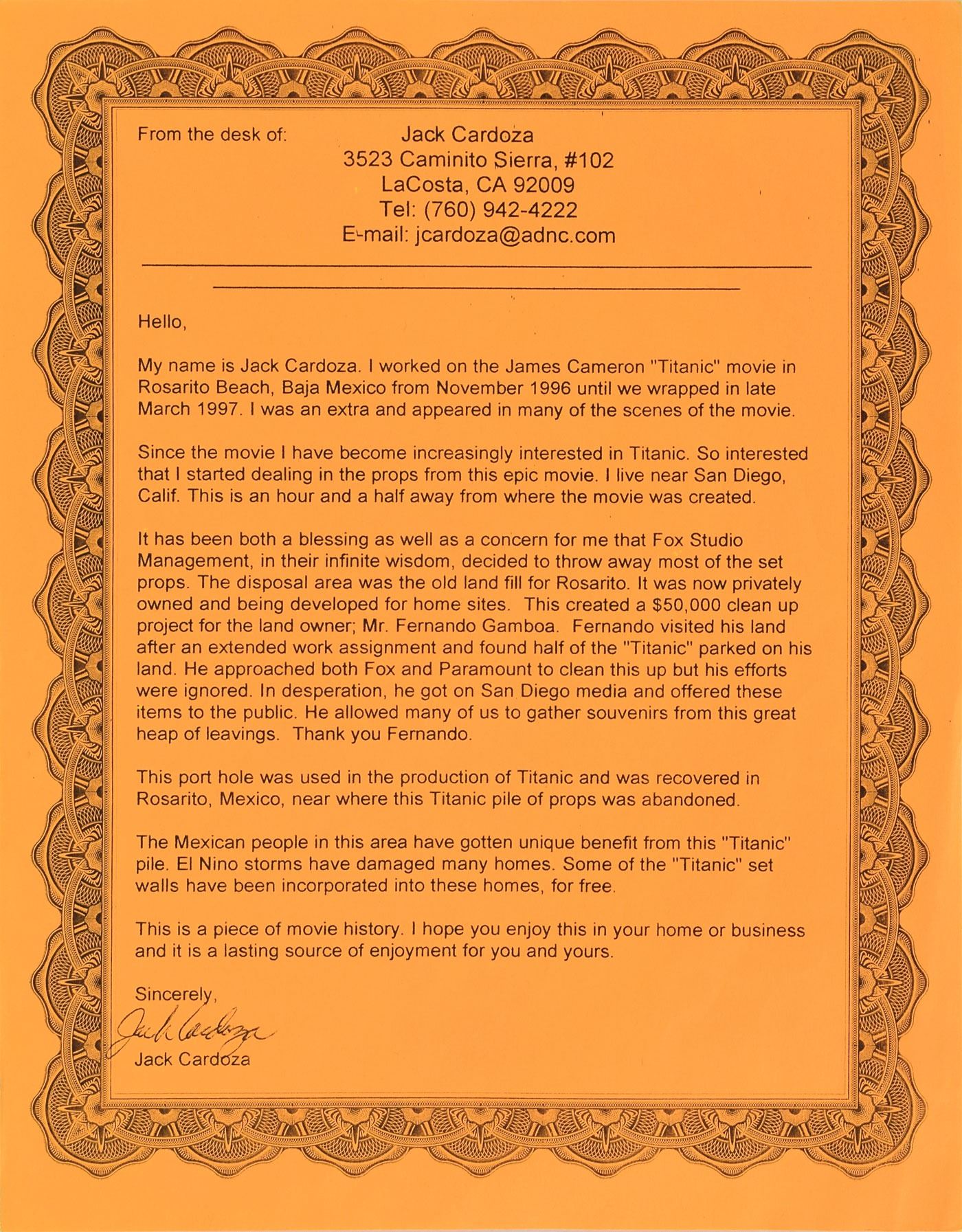 Port hole prop used in the production of James Cameron's classic 1997 film Titanic, measuring 13? in diameter, recovered from the film's 'prop graveyard' in Rosarito, Mexico. In fine condition. Accompanied by a letter of provenance from Jack Cardoza, in part: "I worked on the James Cameron 'Titanic' movie in Rosarito Beach, Baja Mexico from November 1996 until we wrapped in late March 1997. I was an extra and appeared in many of the scenes of the movie…Fox Studio Management, in their infinite wisdom, decided to throw away most of the set props. The disposal area was the old land fill for Rosarito. It was now privately owned and being developed for home sites. This created a $50,000 clean up project for the land owner, Mr. Fernando Gamboa. Fernando visited his land after an extended work assignment and found half of the 'Titanic' parked on his land. He approached both Fox and Paramount to clean this up but his efforts were ignored. In desperation, he got on San Diego media and offered these items to the public. He allowed many of us to gather souvenirs from this great heap of leavings…This port hole was used in the production of Titanic and was recovered in Rosarito, Mexico, near where the pile of props was abandoned."