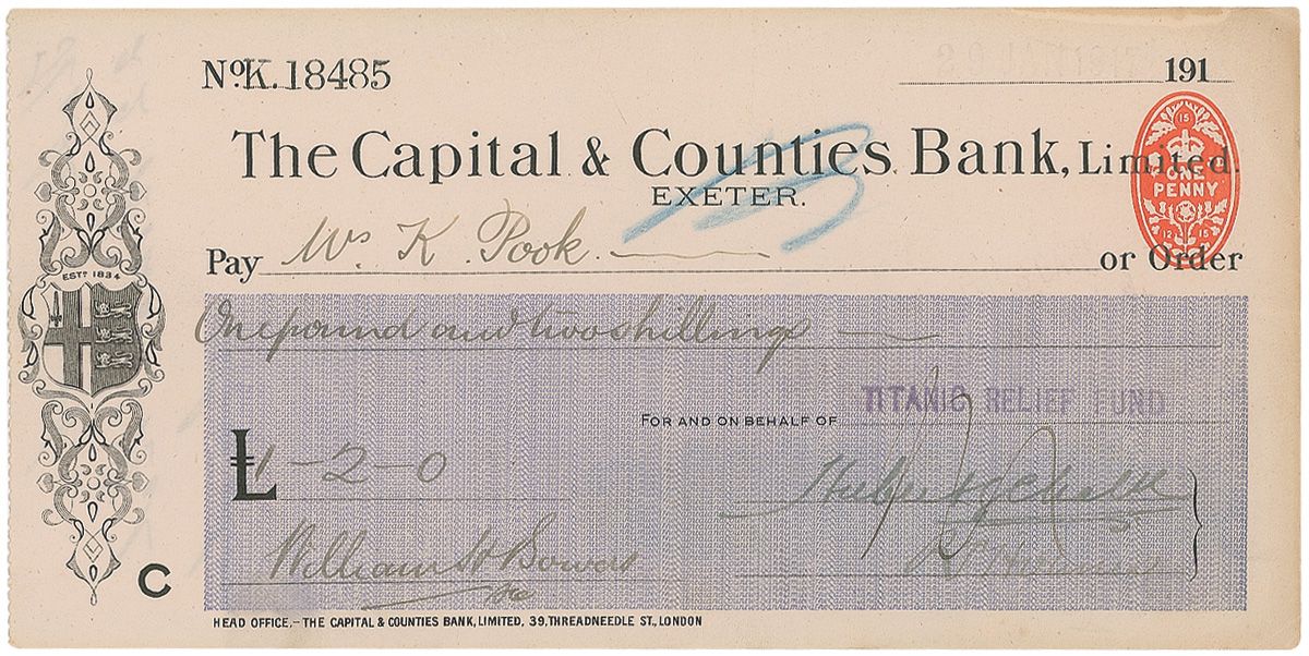 Capital & Counties Bank, Limited Titanic Relief Fund check, 8 x 4, filled out and signed in another hand and stamped “Titanic Relief Fund,” payable to Mrs. K. Pook for one pound and two shillings, no date. Check is endorsed on the reverse by Kate Pook, Percy Pook’s mother. An ink cancellation through signatures, horizontal fold, a blue pencil mark to upper portion, and some scattered light toning and soiling, otherwise fine condition. Percy Pook was a 34-year-old pantry steward on the Titanic who earned 3 pounds 15 shillings a month. His body was never recovered.