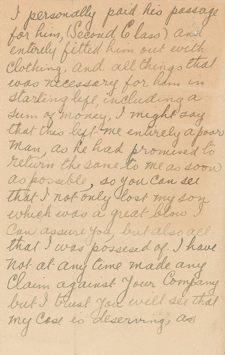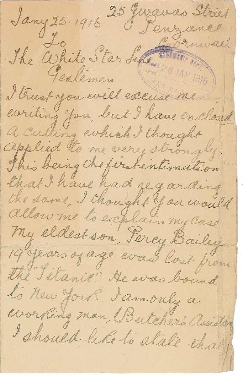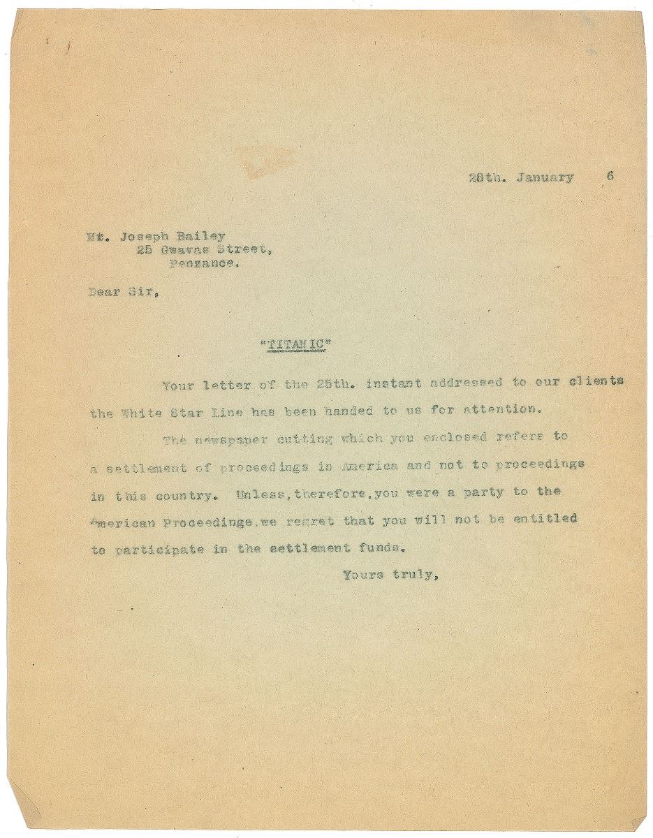 Collection of three pieces of correspondence related to a claim by the family of a young man lost in the Titanic disaster, consisting of a letter by his father, a letter by the White Star Line, and a retained carbon copy of their law firm’s response to the inquiry. The initial ALS signed “Joseph Bailey,” three pages on two adjoining sheets, 4.25 x 7, January 25, 1916, to “The White Star Line,” in full: “I trust you will excuse me writing you but I have enclosed a cutting which I thought applied to me very strongly. This being the first intimation that I have had regarding the same, I thought you would allow me to explain my case. My eldest son Percy Bailey 19 years of age was lost from the ‘Titanic.’ He was bound to New York. I am only a working man, (Butcher’s Assistant). I should like to state that I personally paid his passage for him, (Second Class) and entirely fitted him out with clothing, and all things that was necessary for him in starting life, including a sum of money. I might say that this left me entirely a poor man, as he had promised to return the same to me as soon as possible, so you can see that I not only lost my son which was a great blow I can assure you, but also all that I was possessed of. I have not at any time made any claim against your company but I trust you will see that my case is deserving, as I lost my all in that great disaster. I should be glad to get any information from any one which you should desire including your Penzance agent Messr’s Ludlow & Son with whom I booked the passage, trusting you will see your way [to] help me, the same as others in my great loss.” Includes the newspaper clipping referenced, with a piece headlined “£128,000 for ‘Titanic’ Victims” circled in ink.