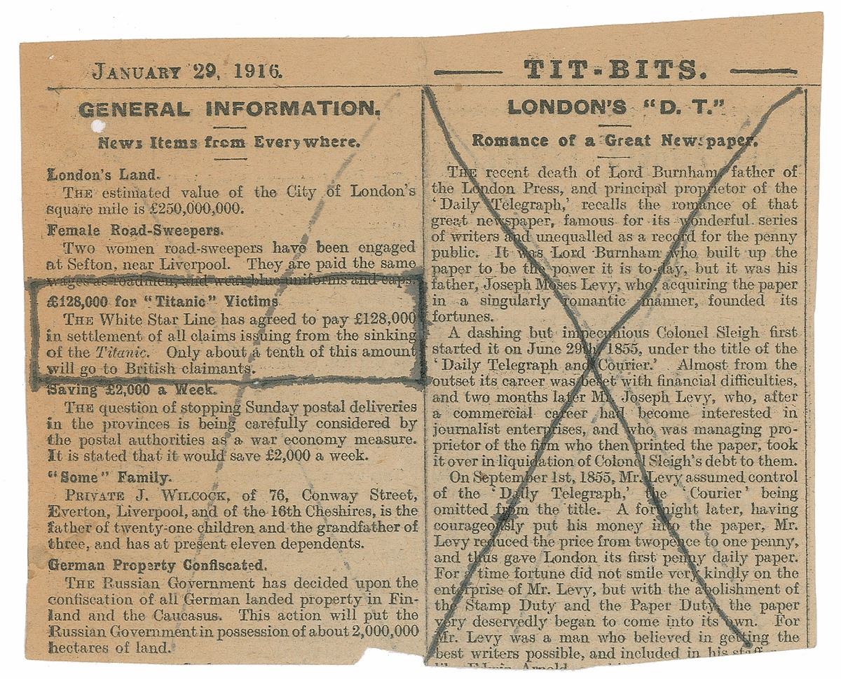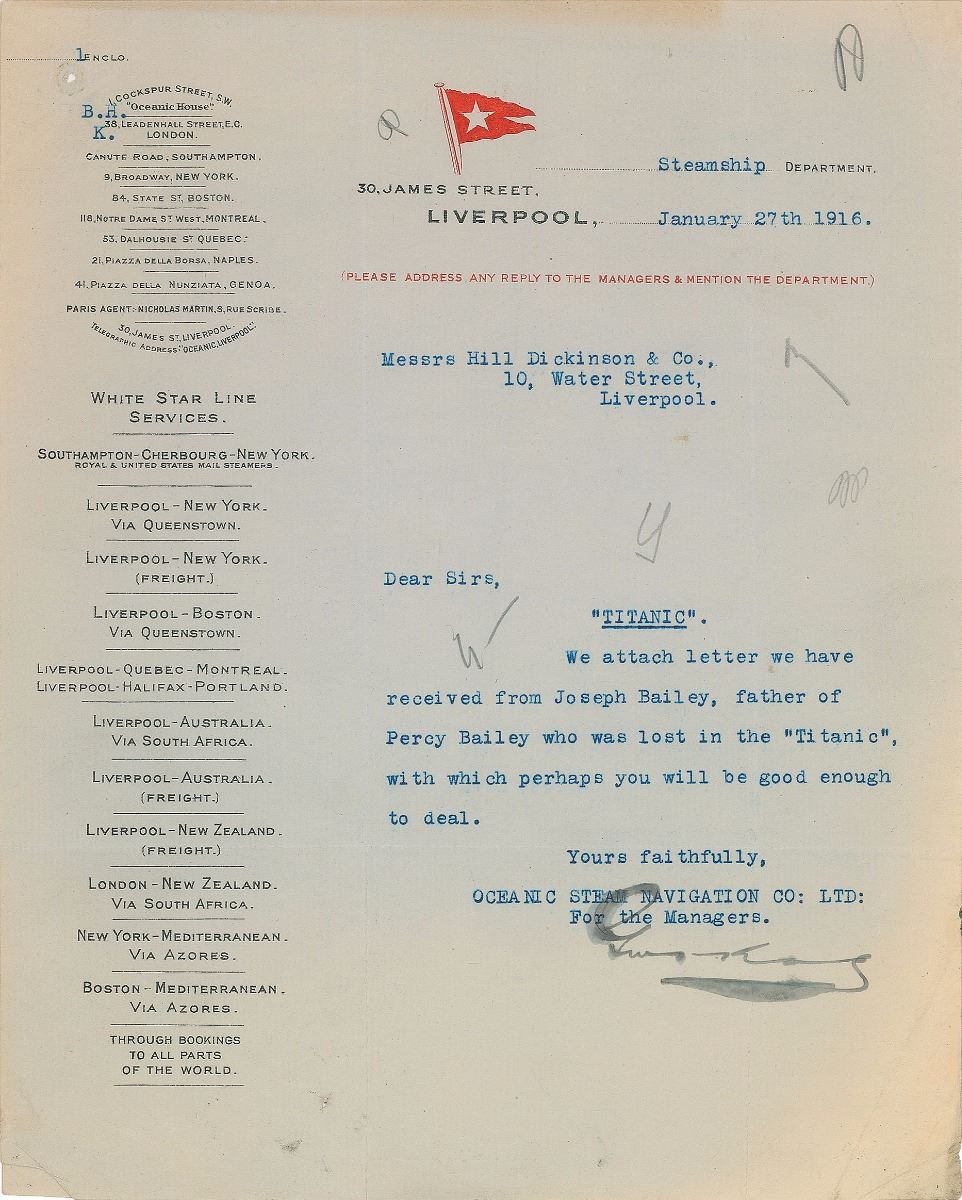 The White Star Line forwards the letter and clipping to their law firm, Hill Dickinson & Co., with a typed letter, January 27, 1916, headed, “Titanic,” in full: “We attach letter we have received from Joseph Bailey, father of Percy Bailey who was lost in the ‘Titanic,’ with which perhaps you will be good enough to deal with.” Last is the retained carbon copy of Hill Dickinson’s response to Bailey, January 28, in part: “The newspaper cutting which you enclosed refers to a settlement of proceedings in America and not to proceedings in this country. Unless, therefore, you were a party to the American proceedings we regret that you will not be entitled to participate in the settlement funds.” In overall very good to fine condition, with toning and handling wear.