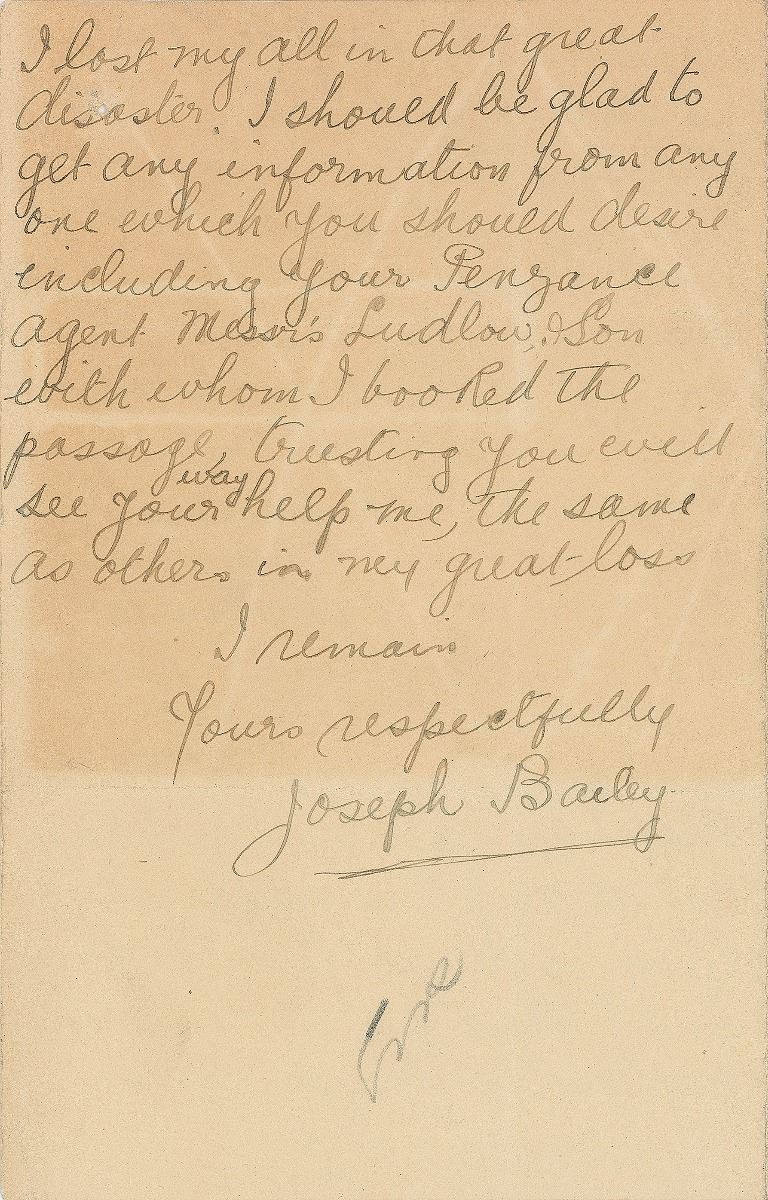 Bailey had lived in Penzance for his entire life and followed in his father’s footsteps as an assistant butcher. Having just turned 18, he decided to go to America and had been hired as a butcher’s apprentice in Cleveland. Though originally booked on the White Star Line’s RMS Oceanic, he transferred his reservation to the Titanic upon learning that friends of his would be traveling on the steamer. He planned to visit an uncle in the Bronx before going on to Cleveland to begin his apprenticeship, but was tragically lost in the disaster and his body was never recovered.