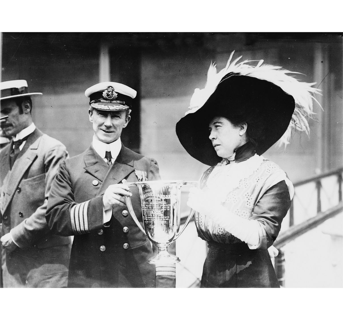 Once aboard the Carpathia, Margaret Brown continued to assist her fellow passengers, nursing their wounds and comforting them with optimism—her fluency in English, French, German, and Russian enabled her to communicate with nearly all on board. Once everyone was stable, her philanthropic side kicked in and she established a committee to raise money for destitute survivors, collecting $10,000 from well-to-do passengers before the Carpathia even reached New York. Then, as a member of this 'Survivor's Committee,' she arranged for a ceremony to recognize the heroic Carpathia crew, where she presented every crew member with a crimson-ribboned medal and Captain Rostron with the Loving Cup. This historic cup has remained in the Rostron family ever since that day—May 29, 1912—and has been on loan to the Merseyside Maritime Museum and Ulster Folk and Transport Museum since the 1980s.