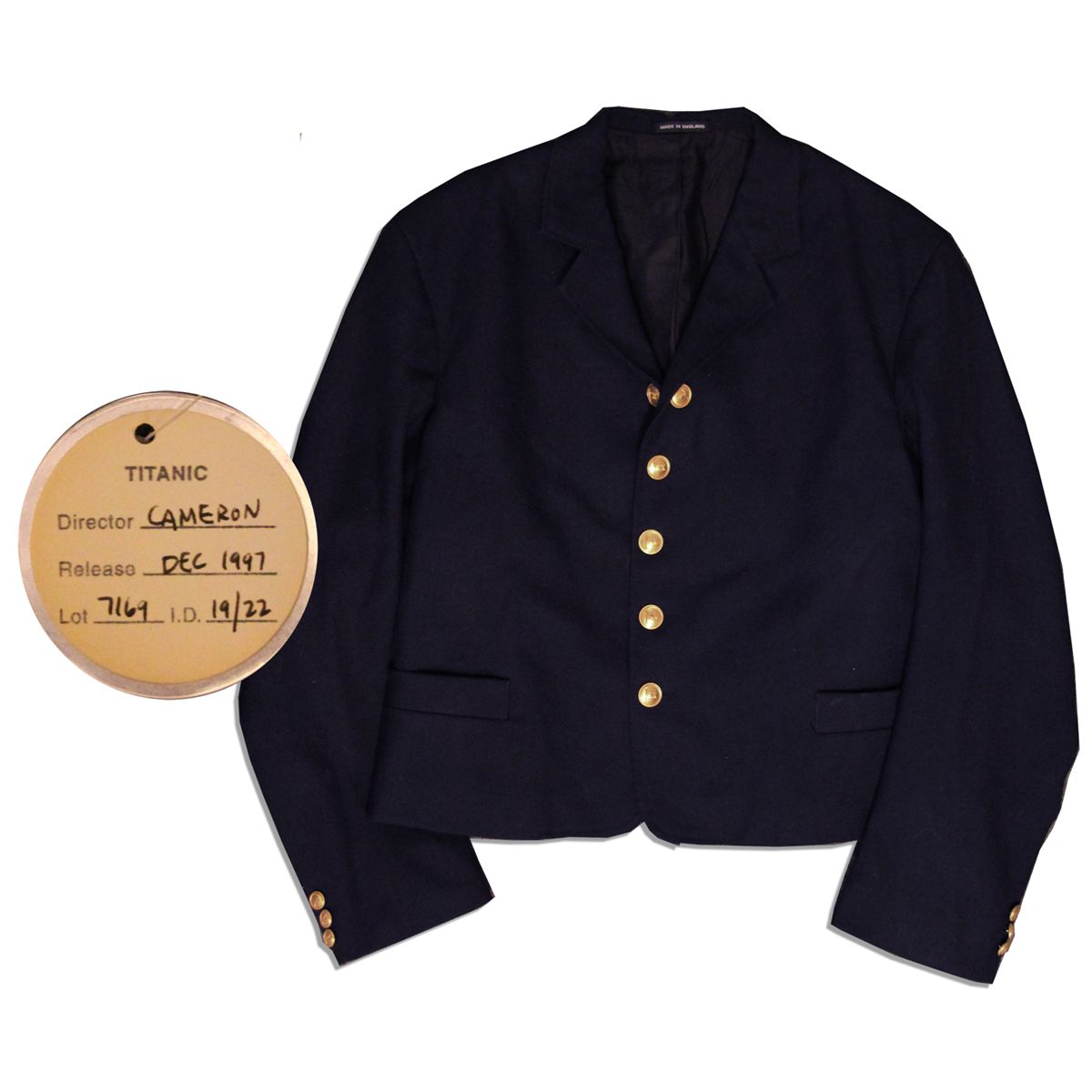 Screen-worn steward's jacket used in James Cameron's 1997 blockbuster, ''Titanic.'' Navy twill steward coat with gold buttons was used in the memorable dining scenes which took place in the first class cabin. With a COA from 20th Century Fox reading in part: ''...short twill jacket worn in first class dining room scenes...'' Original wardrobe tag is affixed to the sleeve, with 20th Century Fox logo and handwritten notations of director's name ''Cameron'' and release dated ''Dec 1997''. Fully-lined wool jacket has a ''Made in England'' label sewn in. Near fine.