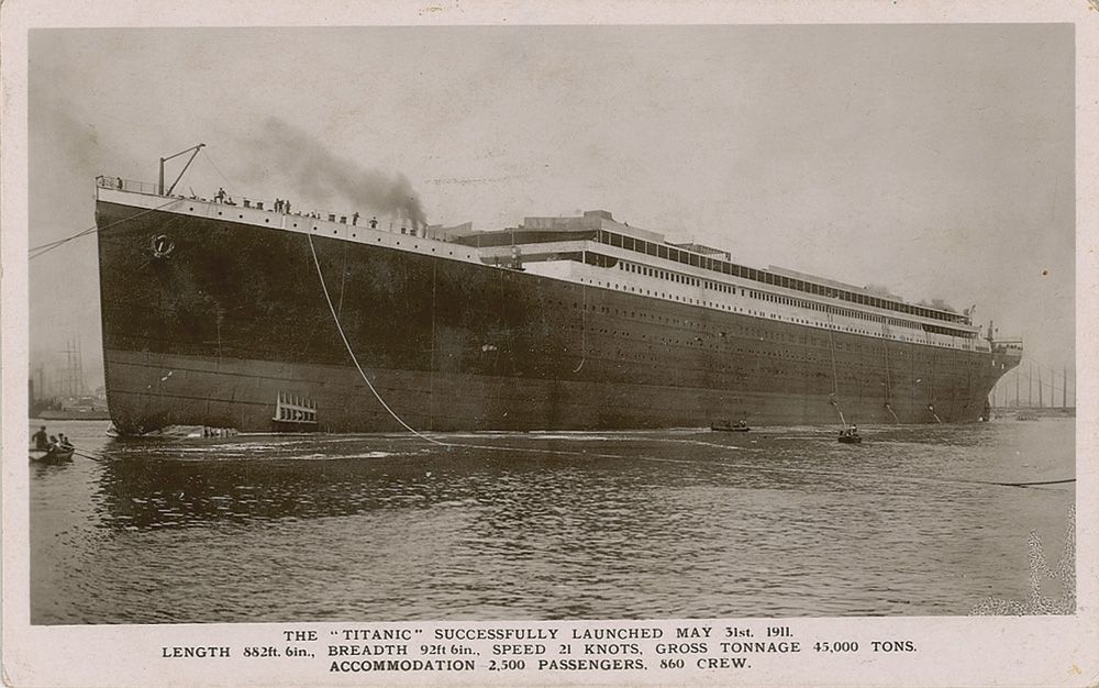 Unused ‘Real Photo Series’ postcard by Walton of Belfast, featuring a real photo of the Titanic at its launch, captioned at the bottom: “The ‘Titanic’ Successfully Launched May 31st, 1911. Length 882ft. 6in., Breadth 92ft. 6in., Speed 21 Knots, Gross Tonnage 45,000 Tons, Accommodation 2,500 Passengers, 860 Crew.” In fine condition, with some light rubbing to the finish.