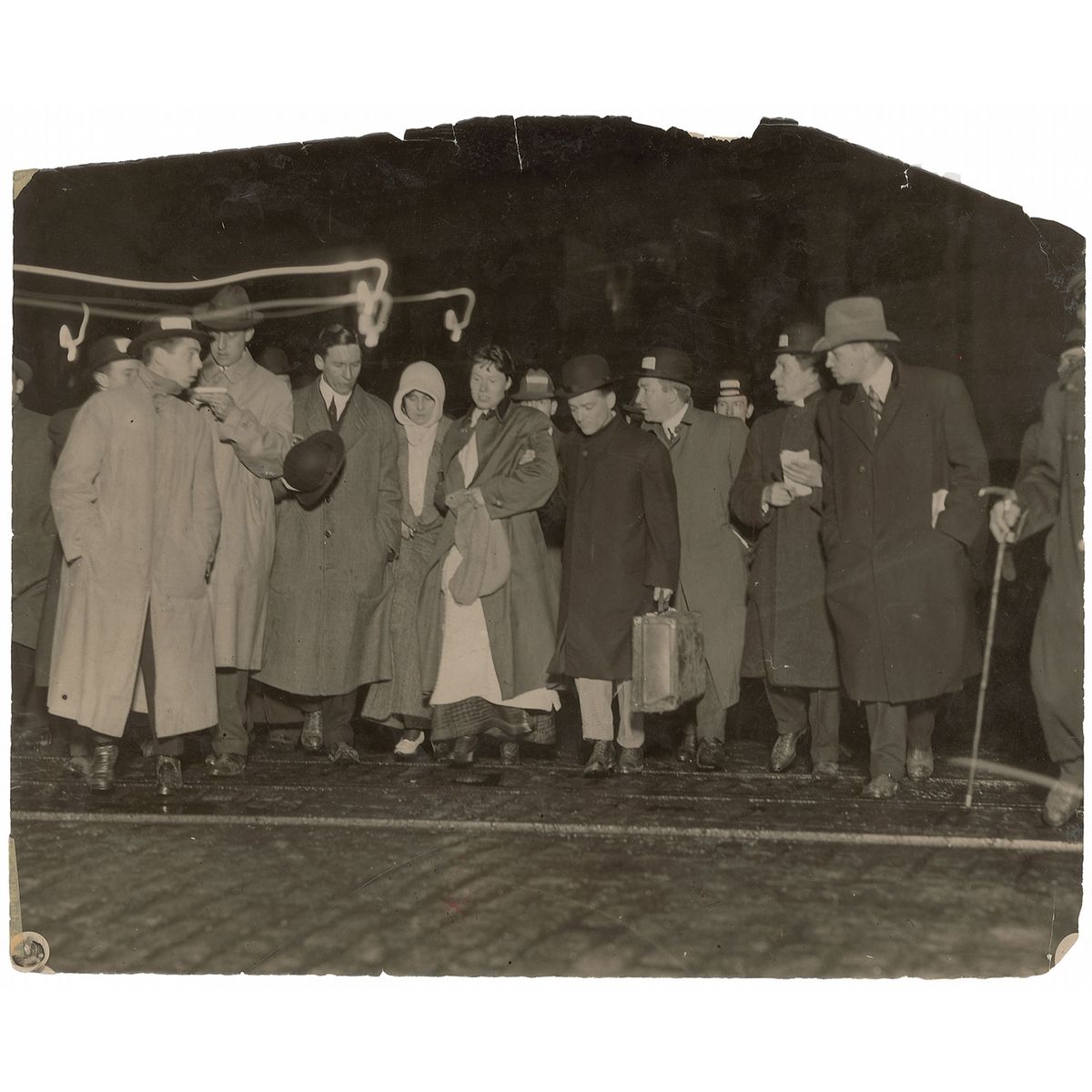 Original vintage 9.75 x 7.5 New York Times/American Press Association press photo of two Titanic survivors coming off the Carpathia and surrounded by a throng of reporters on April 17, 1912. Reverse bears a New York Times stamp as well as several other date stamps. Paper loss to top edge and corners, a few small edge tears, and light overall creasing and wrinkling, otherwise very good condition. Provenance: Caren Archive, New York Times.