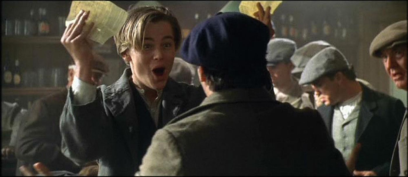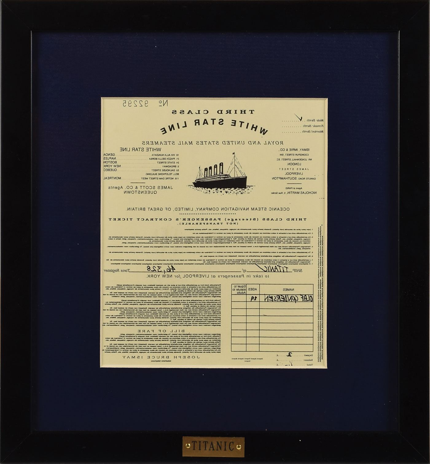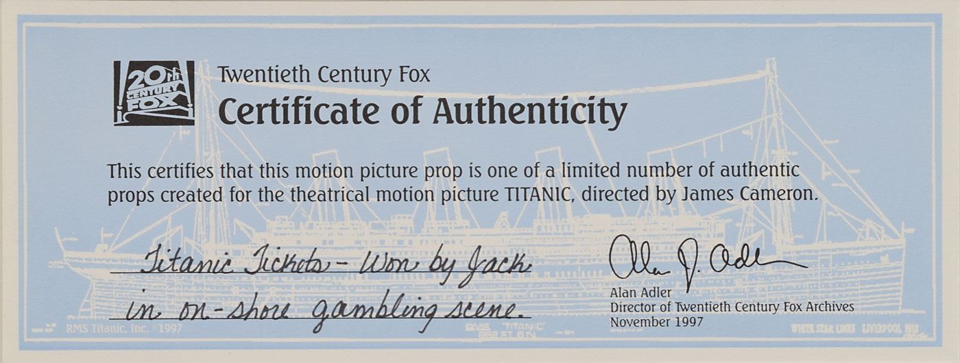 Titanic third-class passenger's contract ticket prop, won by Jack Dawson (portrayed by Leonardo DiCaprio) in the fateful on-shore poker scene at the beginning of James Cameron's Oscar-winning 1997 masterpiece Titanic. In the scene, Jack wins the ticket from gambler Olaf Gunderson, whose name is filled in as the passenger at the bottom. Interestingly, the ticket is printed as a mirror image. For exterior scenes, Cameron had built a nearly full-size replica of the starboard side of the ship. Therefore, in order to show the ship's departure from the port side, Cameron had to film from the starboard side and flip the image in post production—all text and imagery on the ship and props in these scenes had to be reversed in order to come out correctly. The ticket measures 5.5 x 6.5, and is matted and framed to an overall size of 10.5 x 11.25. In fine condition. Accompanied by a certificate of authenticity from 20th Century Fox.