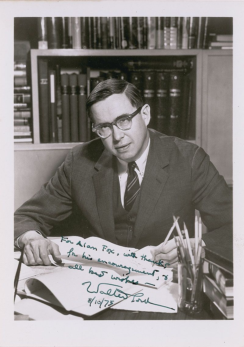 Author of A Night to Remember, an account of the Titanic disaster (1917–2002). Glossy 5 x 7 photo of Fox working at his desk, signed and inscribed in fountain pen, “For Alan Fox, with thanks for his encouragement, & all best wishes—Walter Lord, 8/10/73.” In very fine condition.