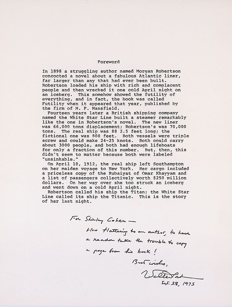 Souvenir typescript from the foreword of A Night to Remember, one page, 8.5 x 11, signed and inscribed at the conclusion in black felt tip, “For Shirley Cohen—How flattering to an author, to have a reader take the trouble to copy a page from his book! Best wishes, Walter Lord, Sept. 28, 1975.” In part: “On April 10, 1912, the real ship left Southampton on her maiden voyage to New York. Her cargo included a priceless copy of the Rubaiyat of Omar Khayyam and a list of passengers collectively worth $250 million dollars. On her way over she too struck an iceberg and went down on a cold April night…the White Star Line called its ship the Titanic. This is the story of her last night.” In fine condition.