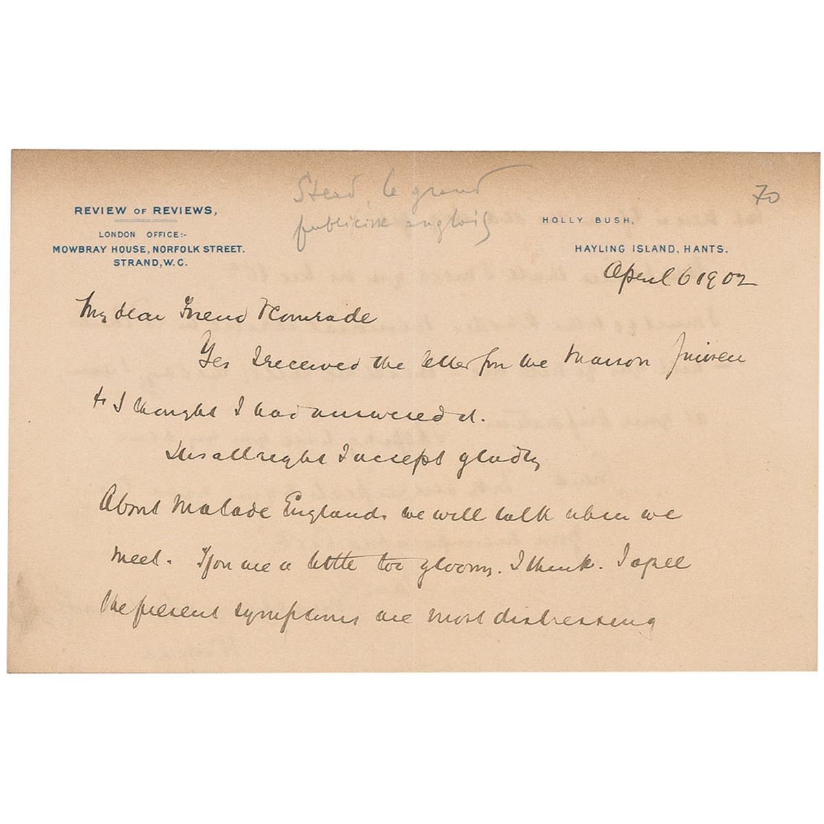 Journalist (1849–1912) and assistant editor of the Pall Mall Gazette famous for his anti-vice crusade and founder of The Review of Reviews who drowned in the Titanic disaster. He is widely considered to be the founder of modern journalism. ALS signed “W. T. Stead,” one page both sides, 8 x 5, Review of Reviews letterhead, April 6, 1902. Letter to a friend. In part: “Yes I received the letter from the Maison Juineau & I thought I had answered it. It’s all right I accept gladly about Malade England, we will talk when we meet. You are a little too gloomy I think. I agree the present symptoms are most disheartening but there is life in the old dog yet.” In very good condition, with central vertical fold, a few pencil notations, and toning along top edge.