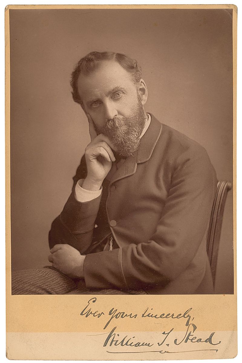 Journalist (1849–1912), assistant editor of the Pall Mall Gazette, and founder of The Review of Reviews who perished in the Titanic disaster. Original 4.25 x 6.25 cabinet photo of Stead posing with his hand on his chin, signed in the lower border in black ink, “Ever yours sincerely, William T. Stead.” An overall block of toning affecting the sentiment and slightly trimmed edges, otherwise fine condition.