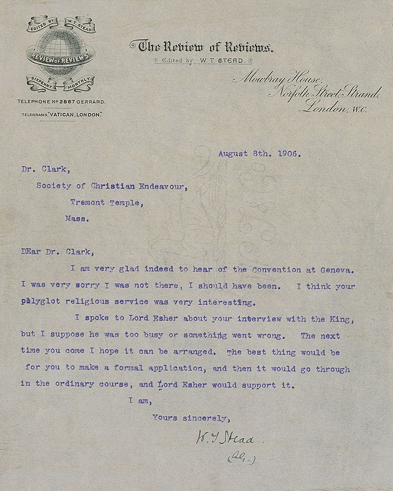 Journalist (1849–1912), assistant editor of the Pall Mall Gazette, and founder of The Review of Reviews, who perished in the Titanic disaster. TLS signed “W. T. Stead,” one page, 8 x 10, The Review of Reviews letterhead, September 8, 1906. Letter to Francis Edward Clark of the Society of Christian Endeavour. In part: “I am very glad indeed to hear of the Convention at Geneva…I spoke to Lord Esher about your interview with the King, but I suppose he was too busy or something went wrong…The best thing would be for you to make a formal application…Lord Esher would support it.” Affixed to a slightly larger sheet. In fine condition, with slight show-through from adhesive to reverse. Diplomats from around the world gathered at the Second Geneva Convention on August 12, 1906, to sign what became one of the four treaties of the Geneva Conventions—an agreement forebodingly named ‘Amelioration of the Condition of Wounded, Sick and Shipwrecked Members of Armed Forces at Sea.’